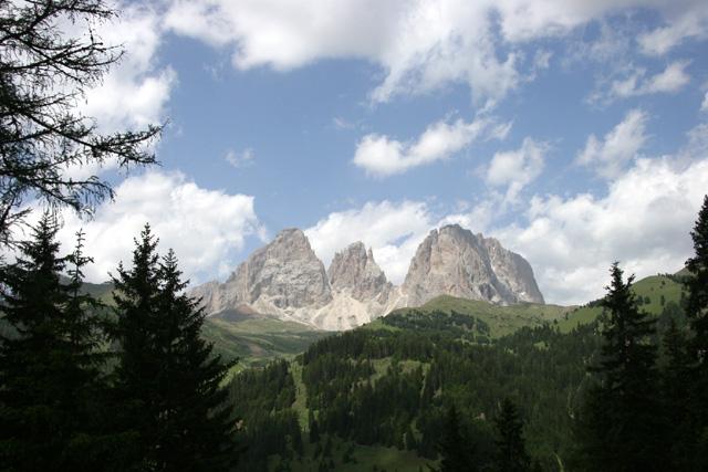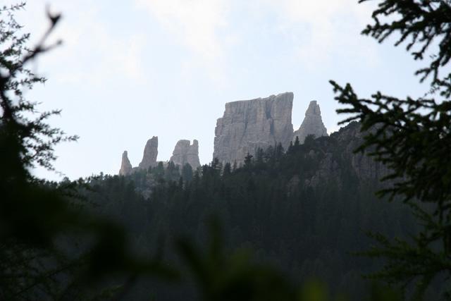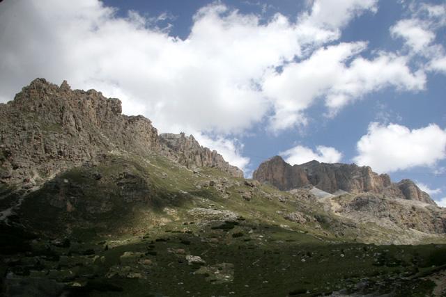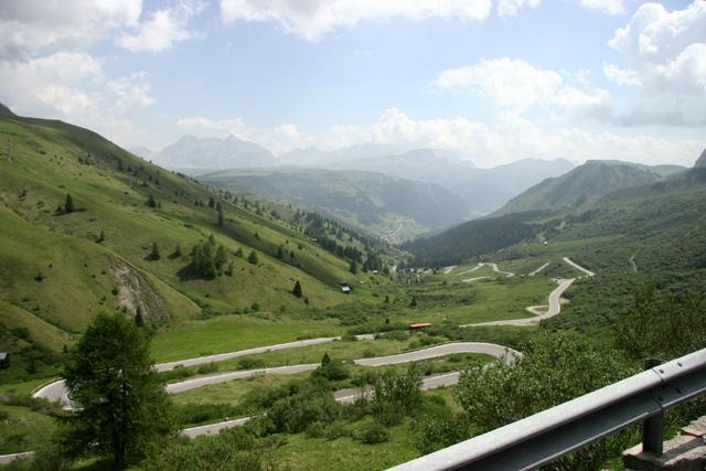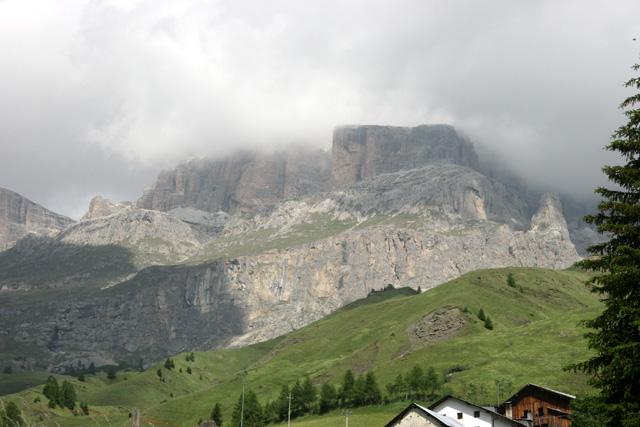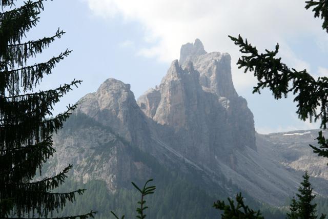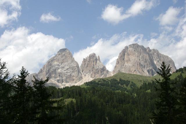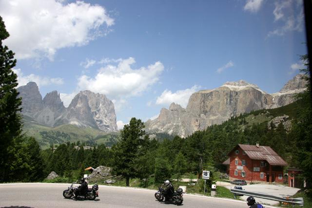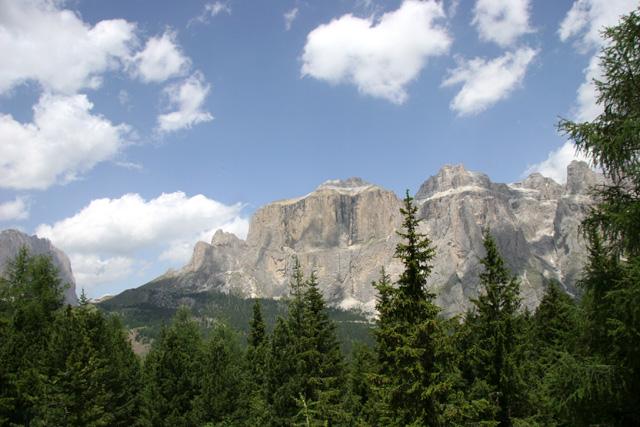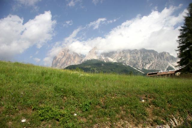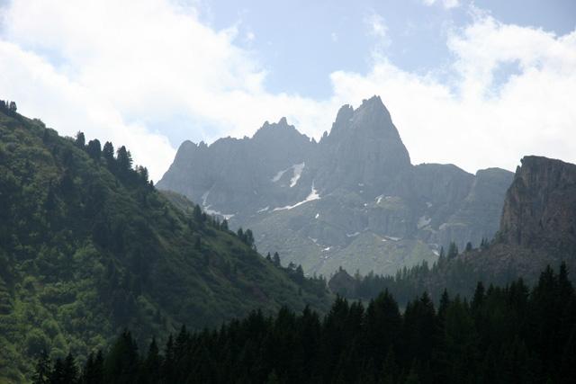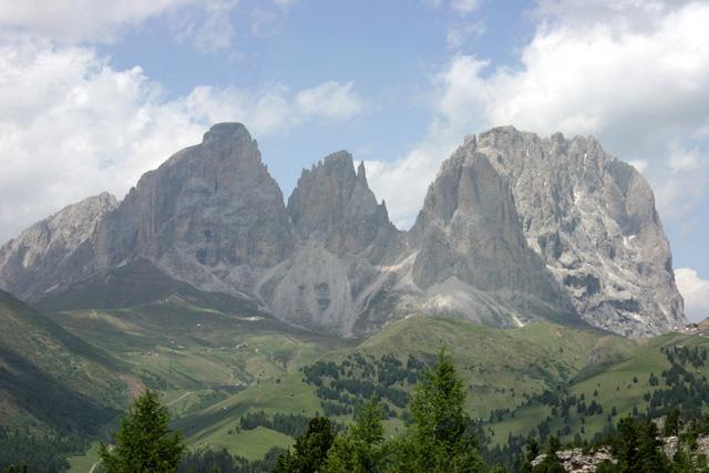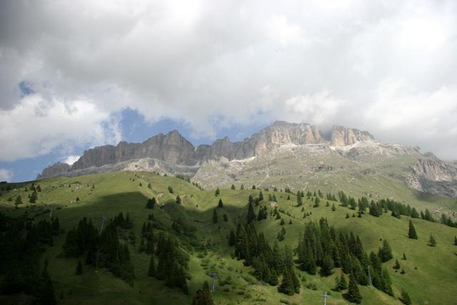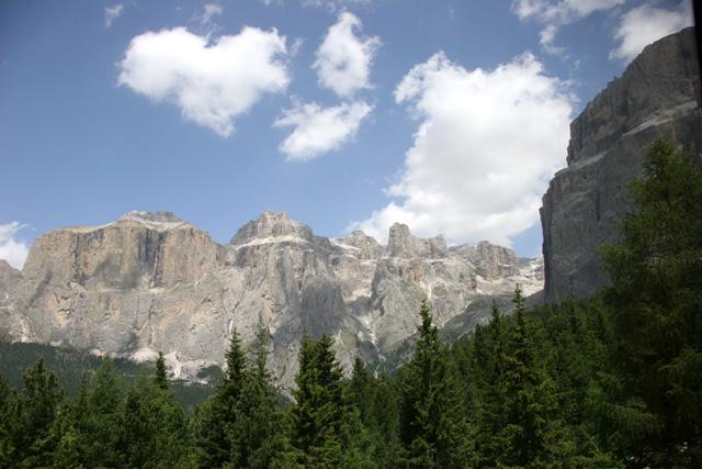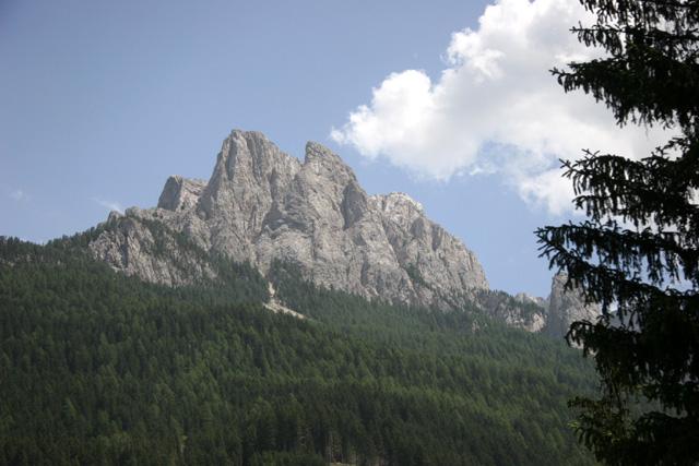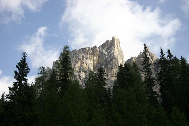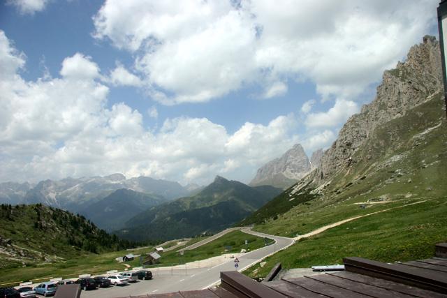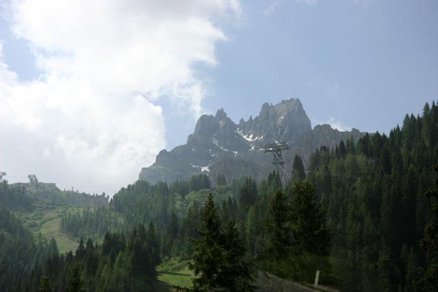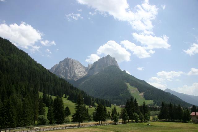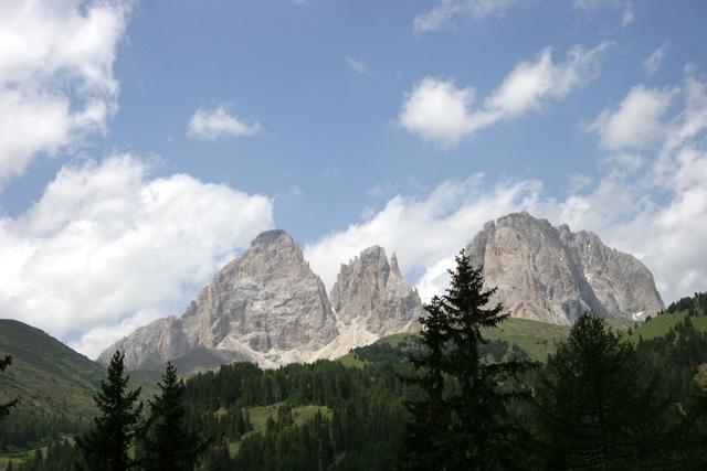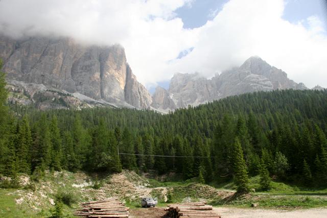 【ドロミテ街道を行く】・・コルチナダンペッツオを出ていよいよドロミテ本街道に入っていく。上下左右何処を見ても素晴らしい景色が続く・・。出発して40'走った所でチンクエ・トリ(5つの塔、2,137m)に出会う。他でもない昨夜の夕食はイタリアン・ピザを食べに行ったがそのお店のトレードマークがこのチンクエ・トリであった。テーブルナプキンにもその絵が描かれていた。特徴のある岩峰でドロミテでも親しまれているようだ。