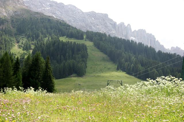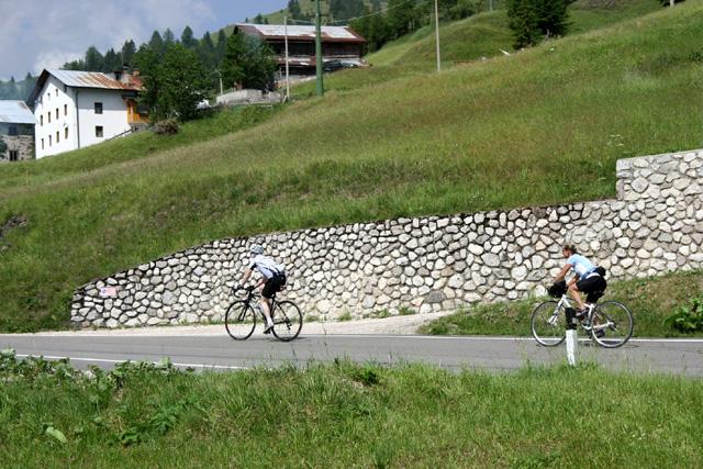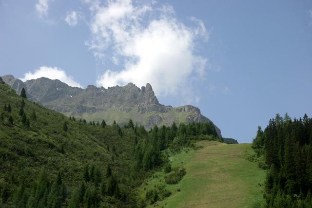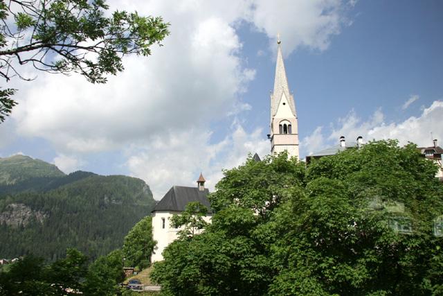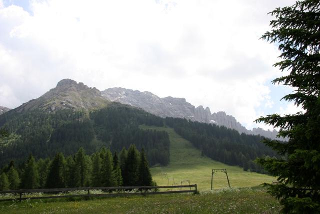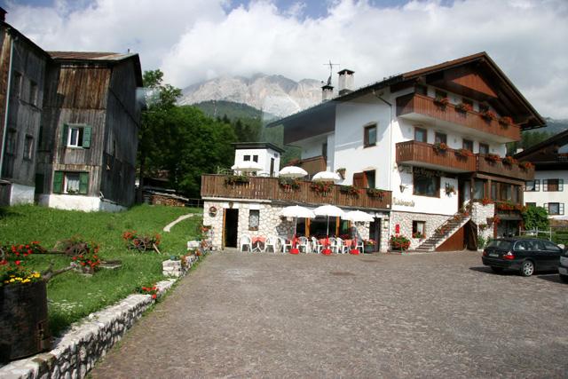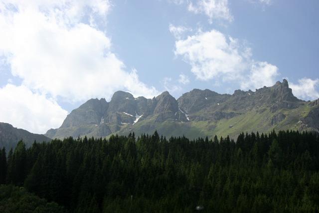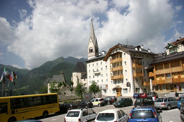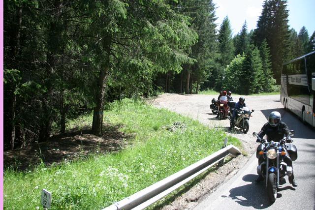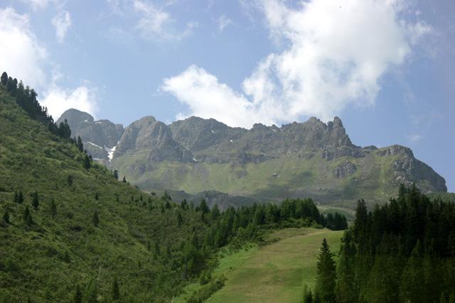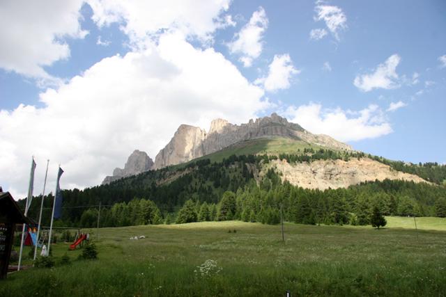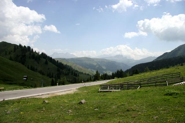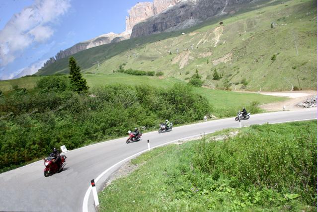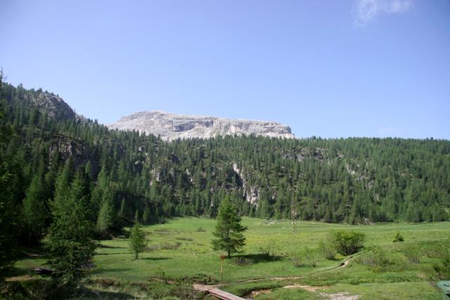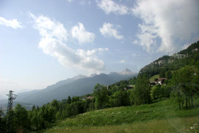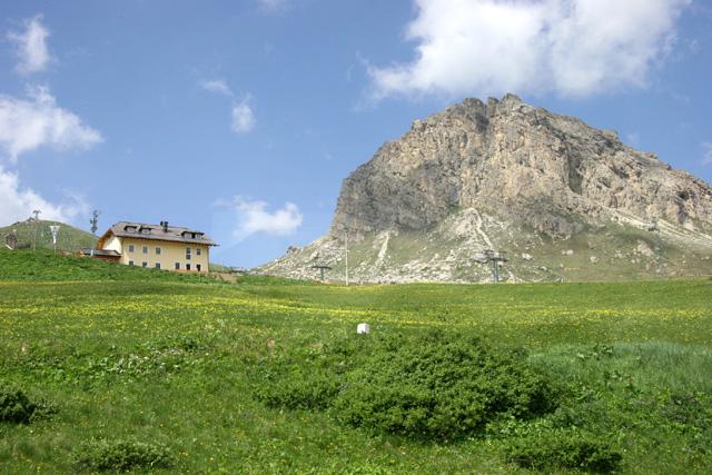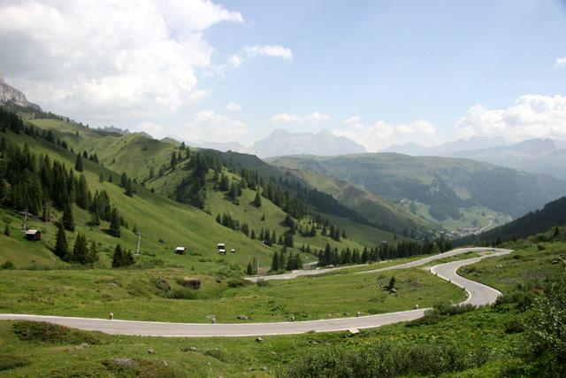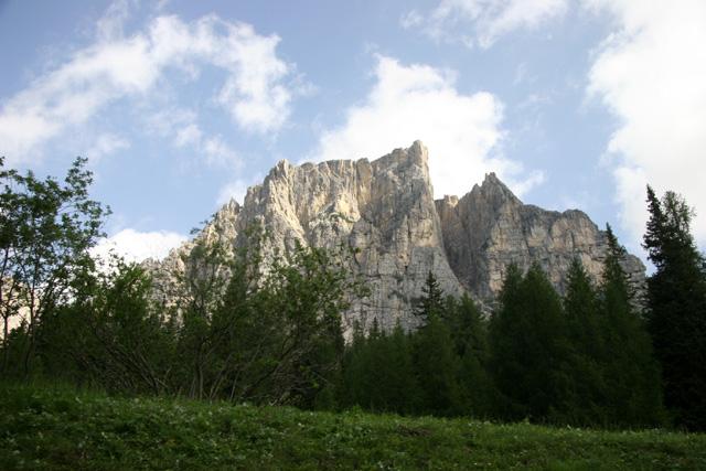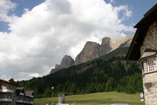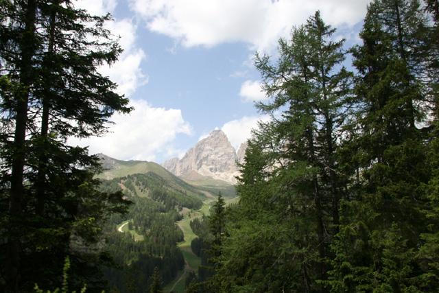 【ドロミテ街道を行く】・・コルチナダンペッツオを出ていよいよドロミテ本街道に入っていく。上下左右何処を見ても素晴らしい景色が続く・・。出発して40'走った所でチンクエ・トリ(5つの塔、2,137m)に出会う。他でもない昨夜の夕食はイタリアン・ピザを食べに行ったがそのお店のトレードマークがこのチンクエ・トリであった。テーブルナプキンにもその絵が描かれていた。特徴のある岩峰でドロミテでも親しまれているようだ。