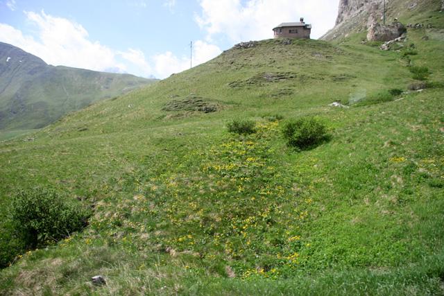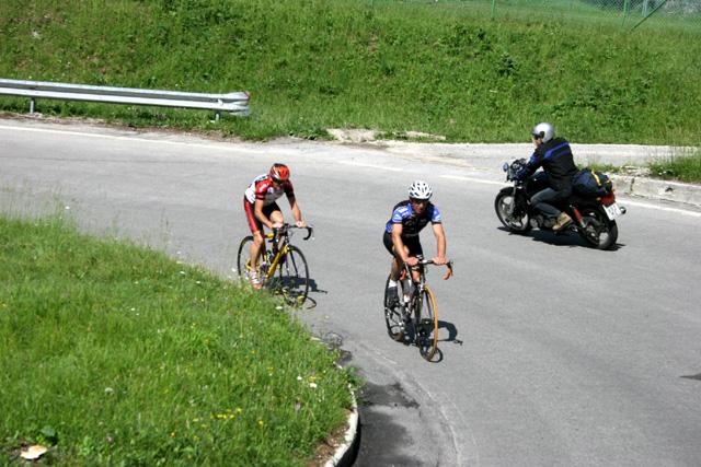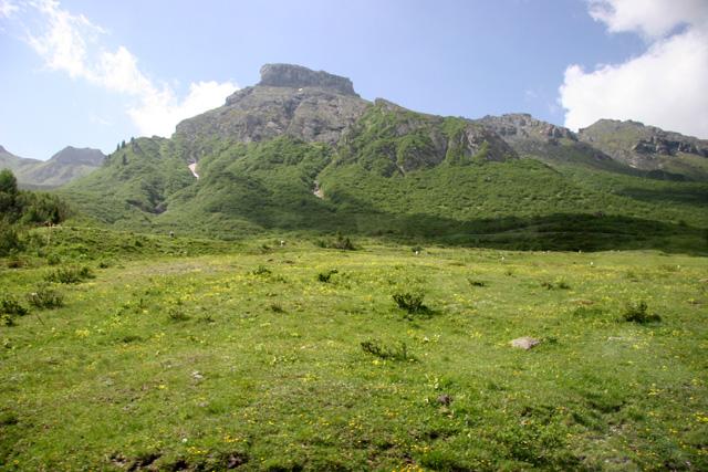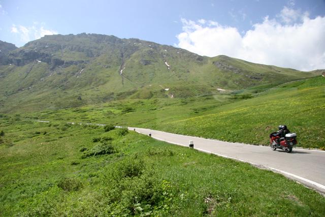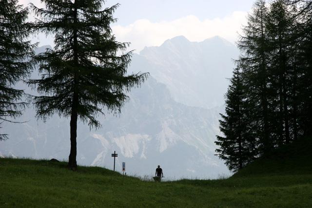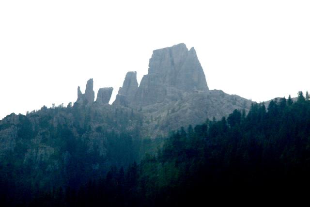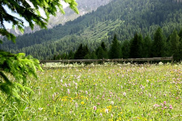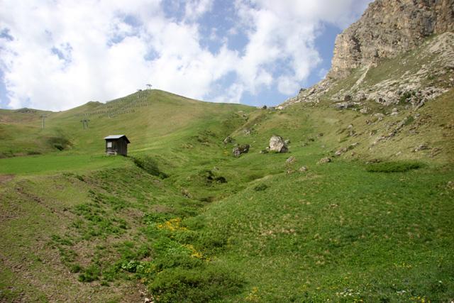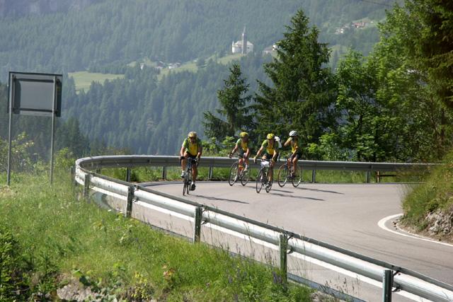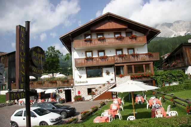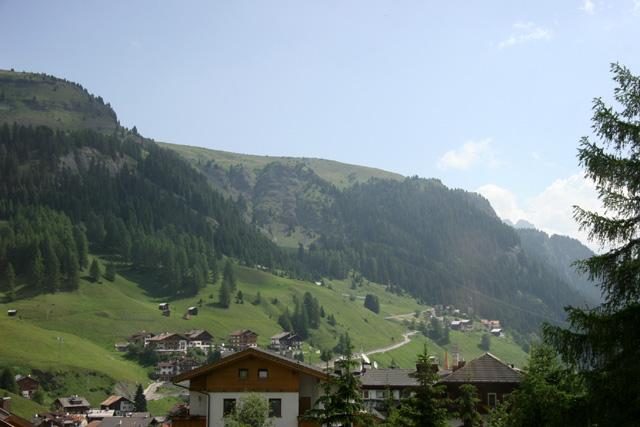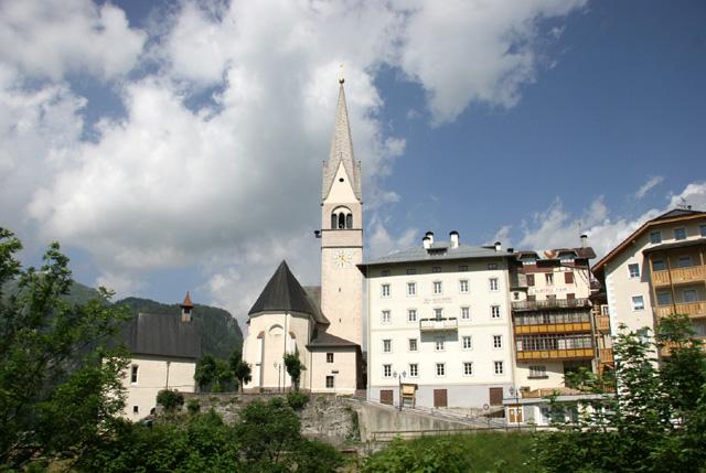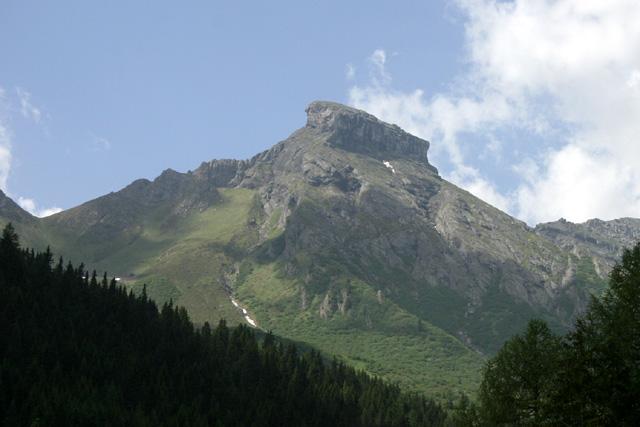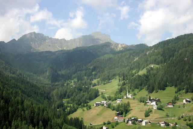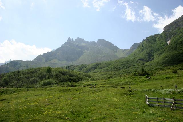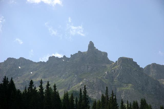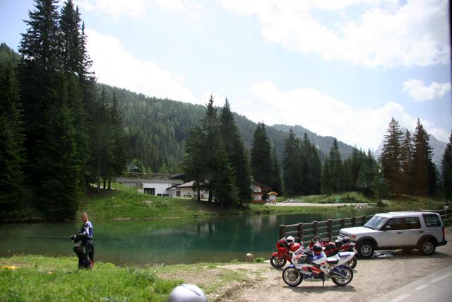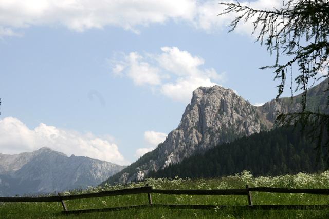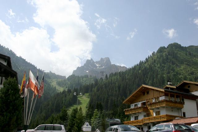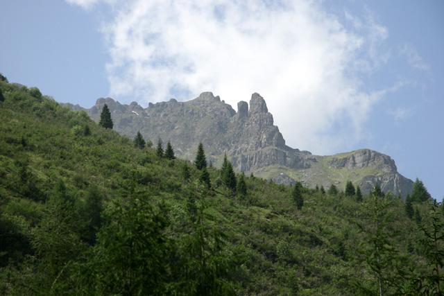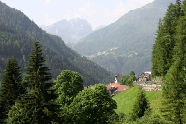 【ドロミテ街道を行く】・・コルチナダンペッツオを出ていよいよドロミテ本街道に入っていく。上下左右何処を見ても素晴らしい景色が続く・・。出発して40'走った所でチンクエ・トリ(5つの塔、2,137m)に出会う。他でもない昨夜の夕食はイタリアン・ピザを食べに行ったがそのお店のトレードマークがこのチンクエ・トリであった。テーブルナプキンにもその絵が描かれていた。特徴のある岩峰でドロミテでも親しまれているようだ。