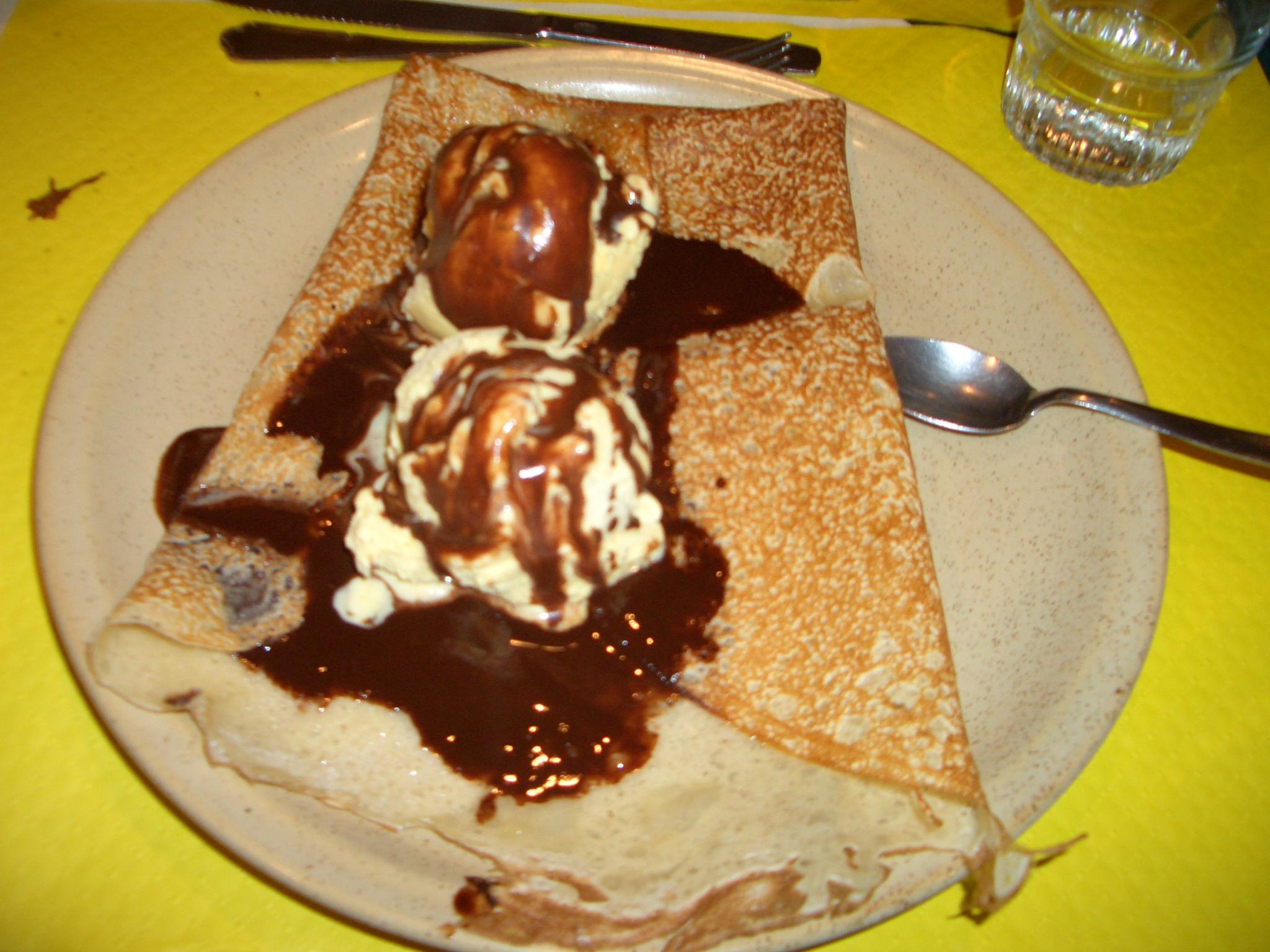 そしてこれで、ごちそうさま〜と思いきや、次のお皿が出てきました。そう、「ランチセット」という事を忘れていました。この時点で既に満腹感十分でしたが、デザートクレープの誘惑に、ぱくぱく進んでしまいます。1皿目のクレープ生地とは少し違い、軟らかめでしっとり。その上に巨大なアイスクリームが2玉、BOOONBOOONとのっていました。日本人にはかなりのボリュームだと思います。
