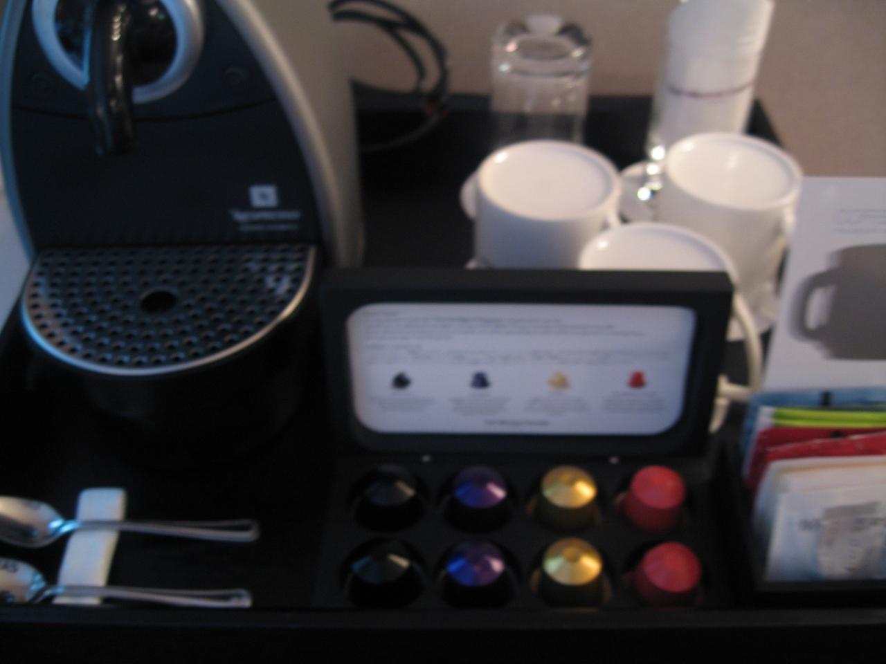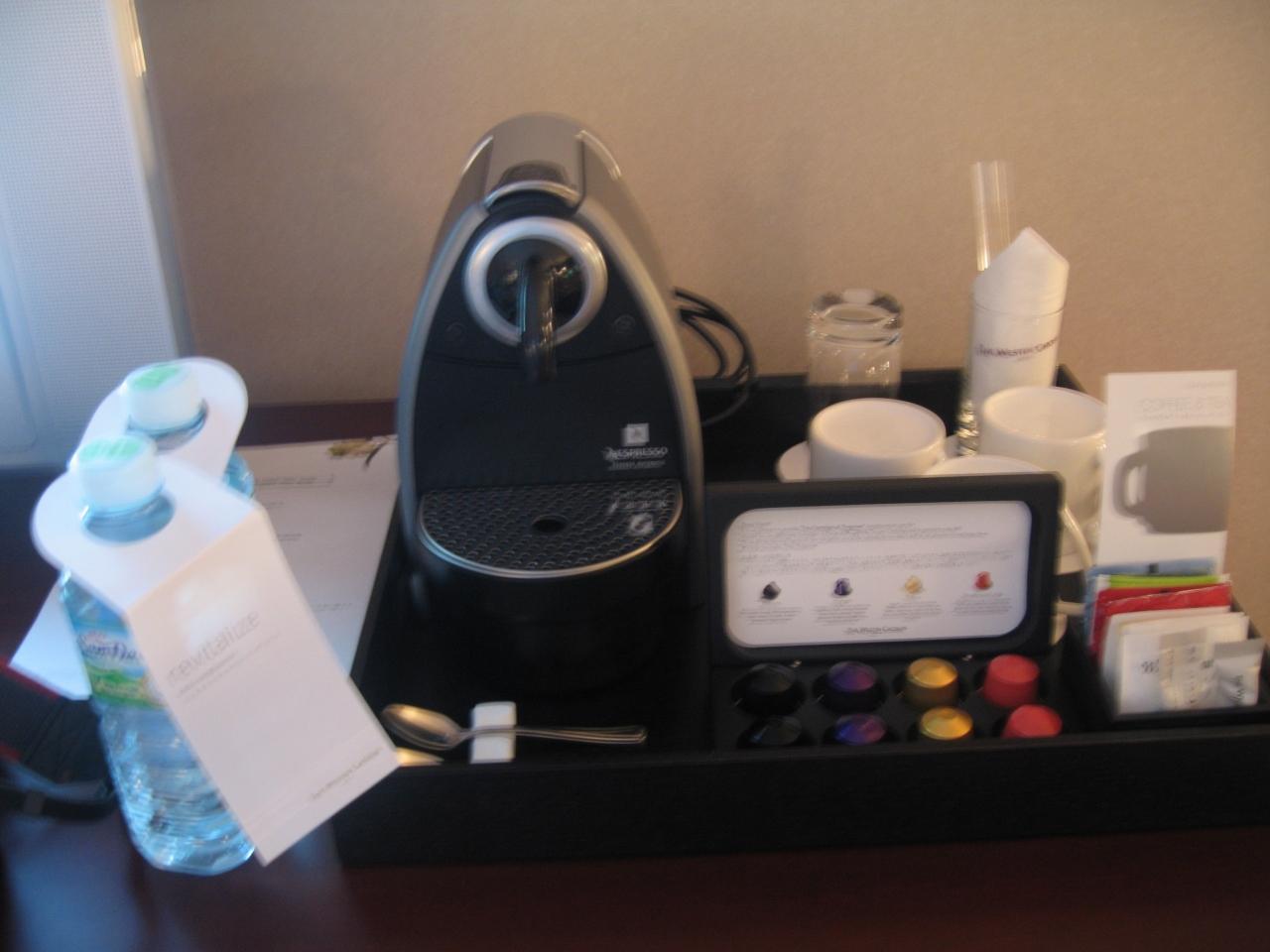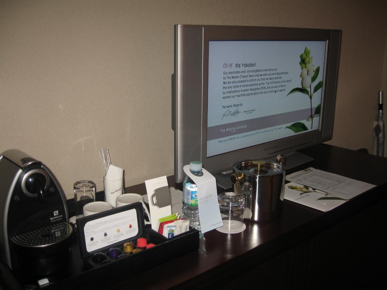 テレビの横にはお茶、ミネラルウォーター2本(無料)、エスプレッソマシーン(1日8杯分無料)が置かれています。