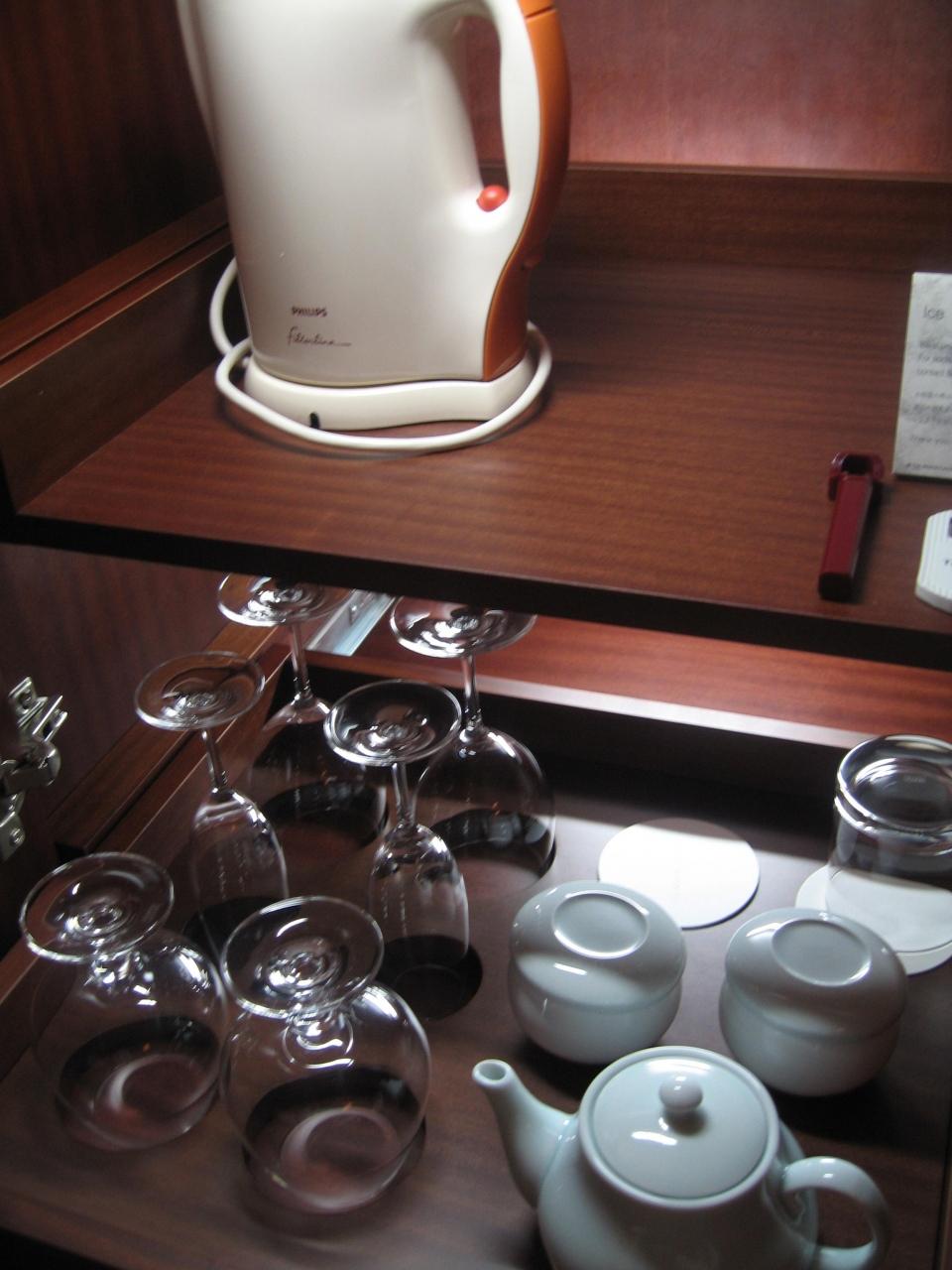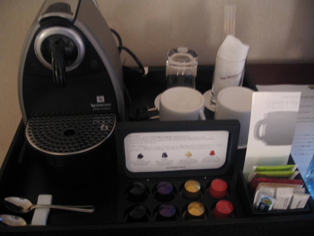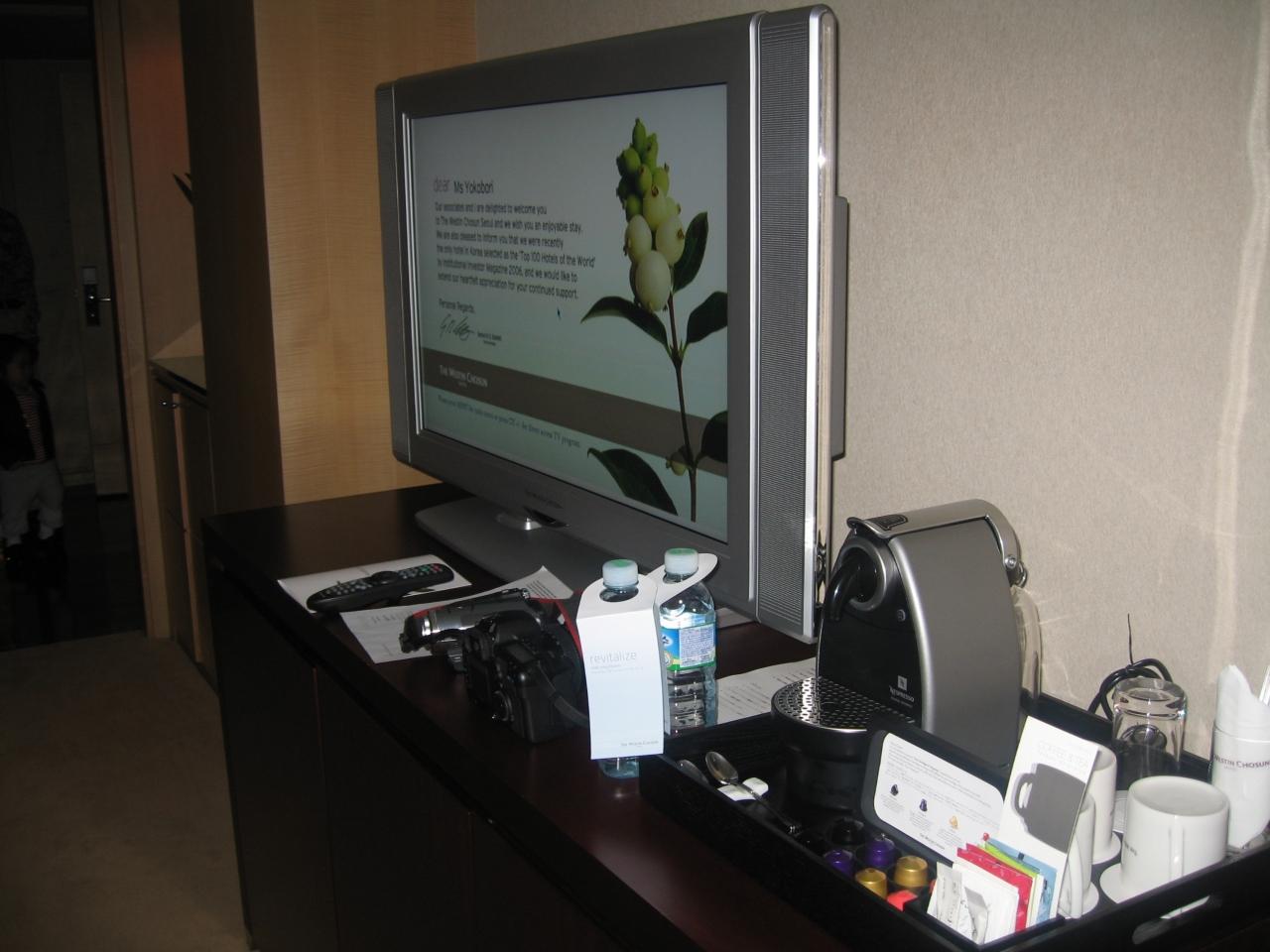 テレビの横にはお茶、ミネラルウォーター2本(無料)、エスプレッソマシーン(1日8杯分無料)が置かれています。