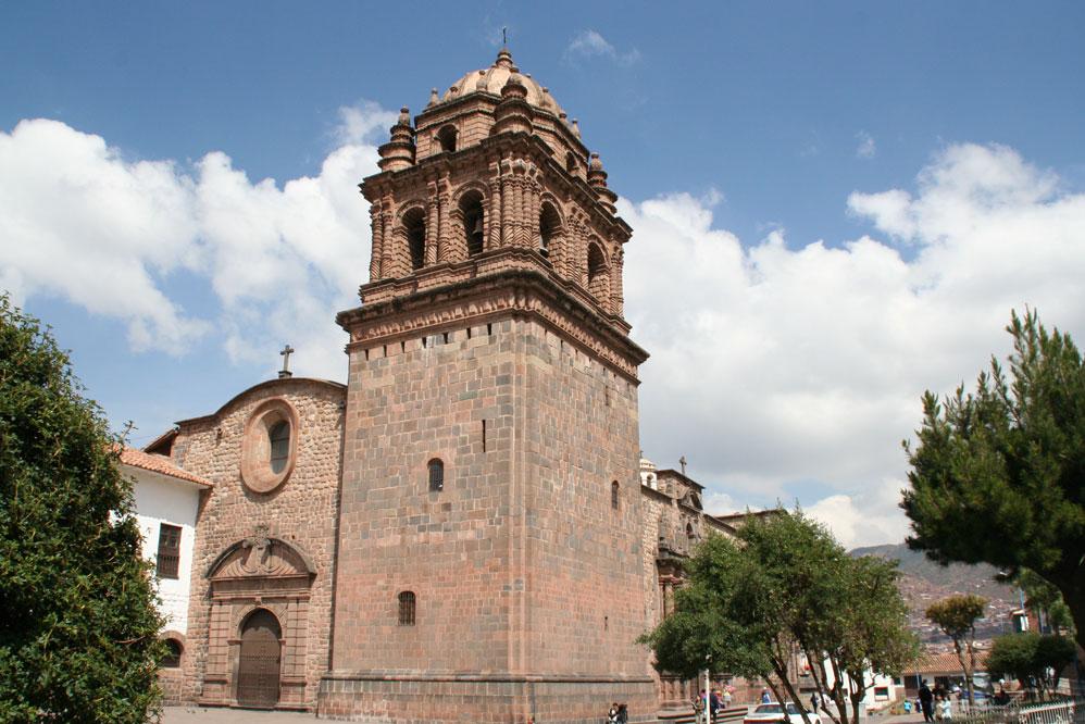 ラ・コンパニーア・デ・ヘスス教会の鐘塔の窓からカテドラルを眺める。正面の丘にサクサイワマン遺跡がある。