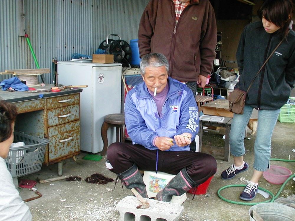 この方が、前日に天然岩牡蠣を取って頂いた地元の方です。早速、牡蠣の開け方教室です。