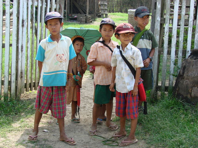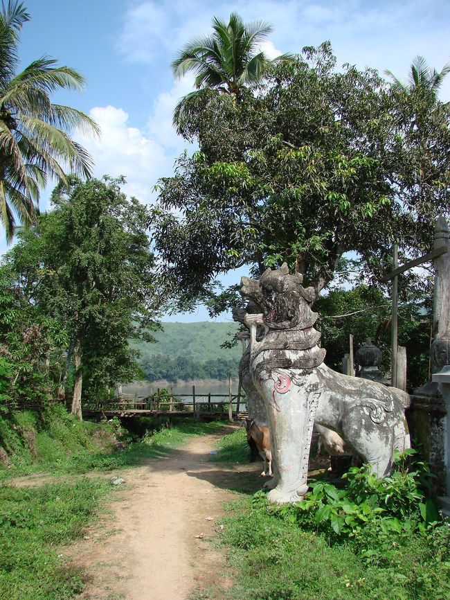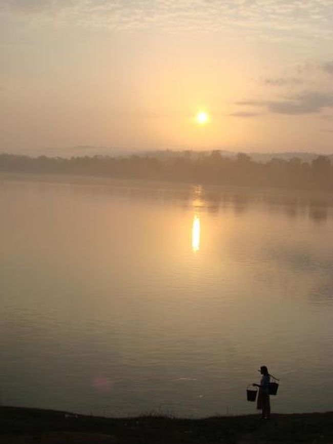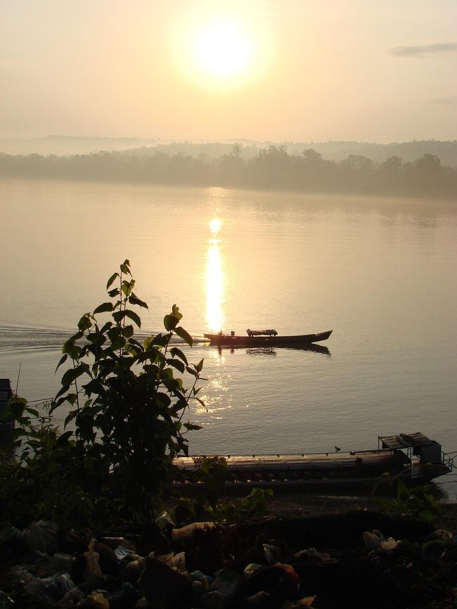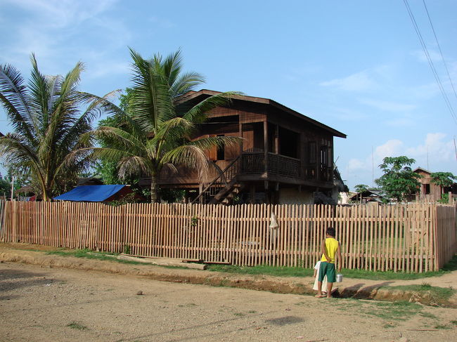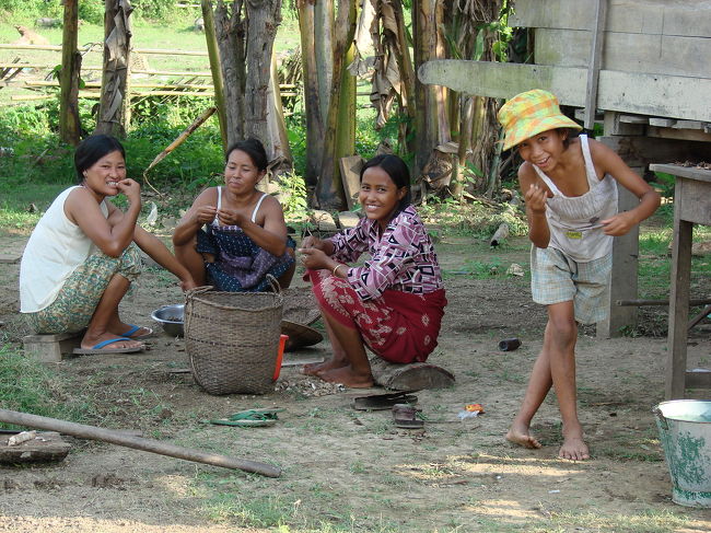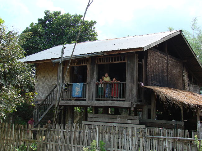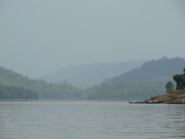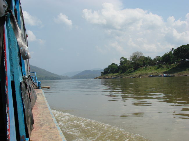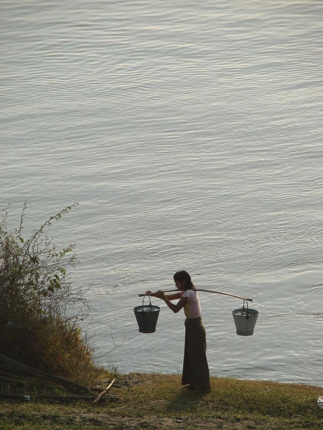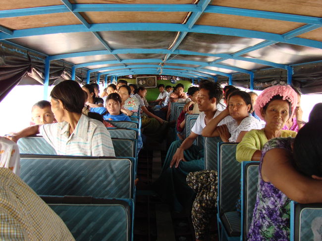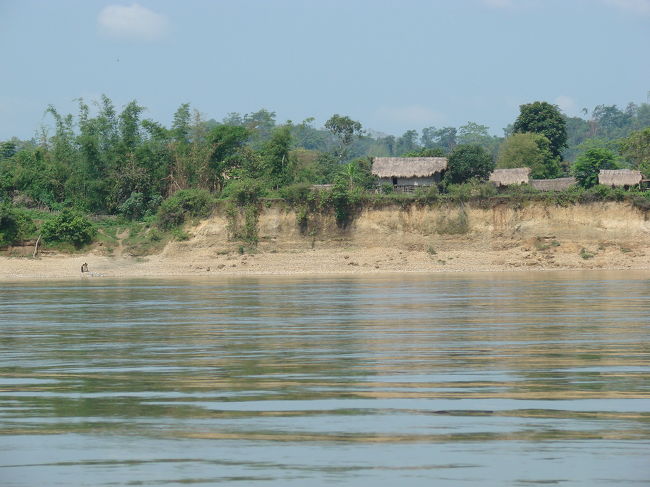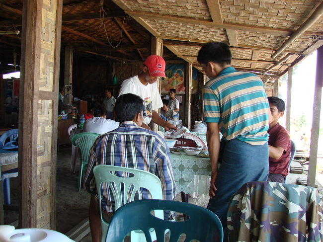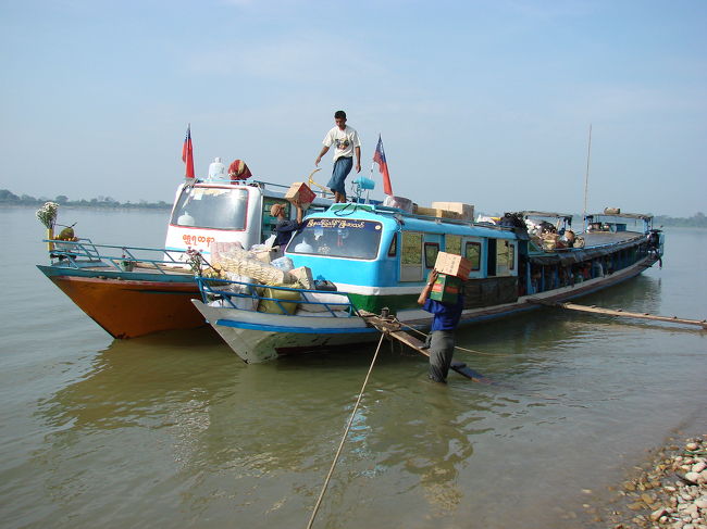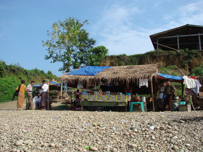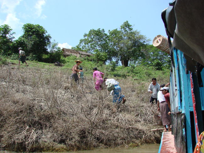 ミッチーナの町から南へ20km位いった所から次の町(村)シンボーへ行く舟が毎日朝11時に出発する.宿を出る前に近くの屋台で麺をすすり,パンと水を買い込みバイタクで船着場へむかっった.小さな舟が岸辺にロープでつながれている少し早めに来たが席は殆んどうまっていた.何とか席を確保して周りを見まわすと乗客達がジッと私を見つめている.かるく手を上げて"ミンガラバー"と声を掛けると皆口々に返事をかえしにこやかな顔つきにかわった.舟が出て暫くすると喉がかわいたので水をのむ,他の人達はコップで河の茶色い水をのんでいた,子供や赤ん坊も....途中で一度昼食の為30分ほど岸に留まり村 で食事をする飯屋の前に小猿が紐でつながれていたが人慣れしていて客にすり寄ったりしていた.シンボーの町へ着くまでに何回か途中の村で乗り降りする人達が沢山の荷物を持って乗船していた,買出しに行っていたのだろう.辺境の生活,不便な事が多いと思うがすむ人達には我が家の在る安住の地なのだろう.