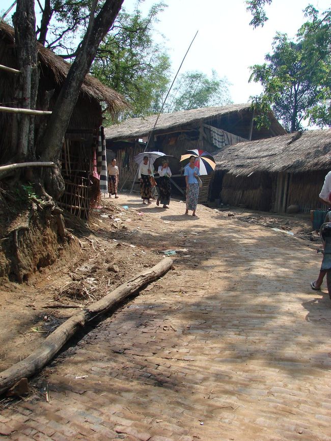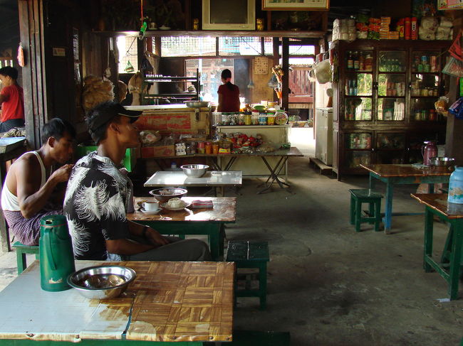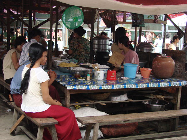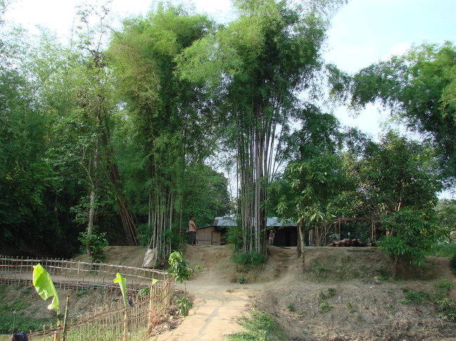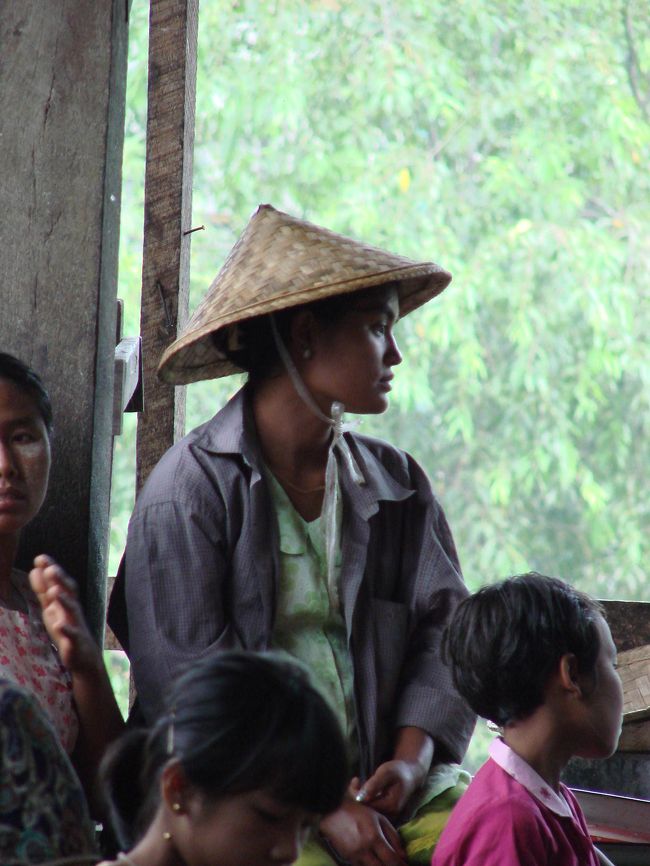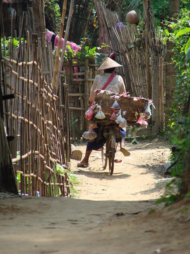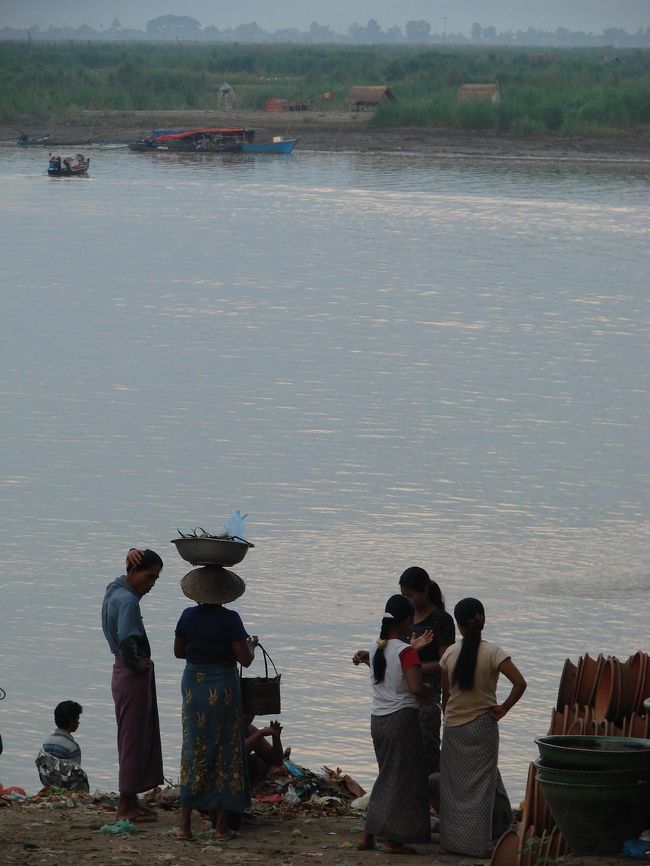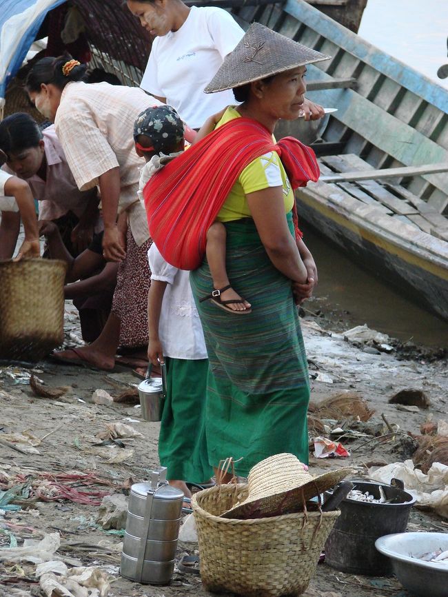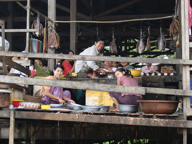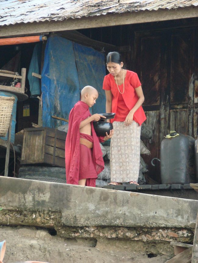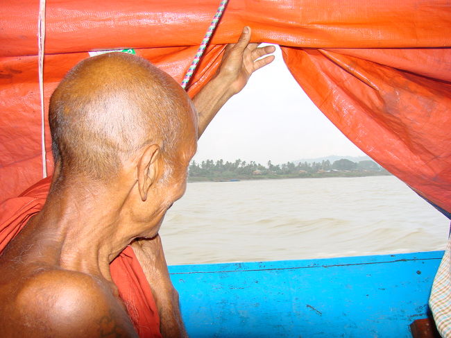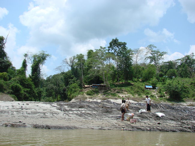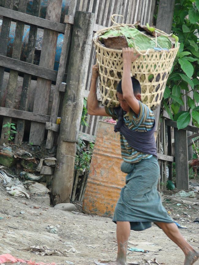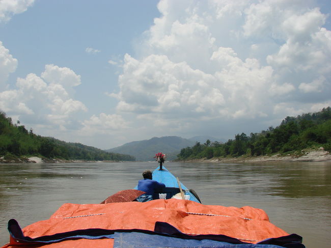 昨夜イミグレーションの人から舟の出発は11時ときいていたので午前中町をぶらつき少し早めに河岸の船着場へ行くと5-6隻くらい舟が接岸して居たので近くの人にバモ!バモ! と行き先の名前を言うと近くの舟を指指しバモ!と教えてくれた.舟にはすでに坊さんが一人のって居てひさしの下で何をするでもなくただ出発をまっていた.熱い日差しの中ポツリ,ポツリ,とバモ方面へ行く人たちが乗船して来た.河の流れはゆるやかで途中一度浅瀬に乗り上げ20分くらいかかって再び流れにのりバモへと向かう.途中スコールにあいひさしに被せてあったシートを広げ雨避けにする.夕方バモに着き宿に荷物を置きさっそく町中をぶらついた.町には2泊したので翌日は町中よりも郊外の方へ足をのばし人々の生活を見てまわった.