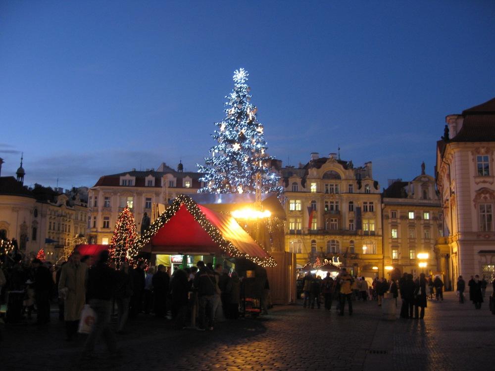 更に暗くなってからのクリスマスツリーです。旧市街広場の周りには、複数の教会やヤンスキー宮殿があります。それらの建物もライトアップです。