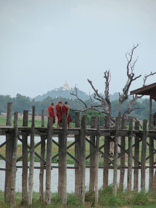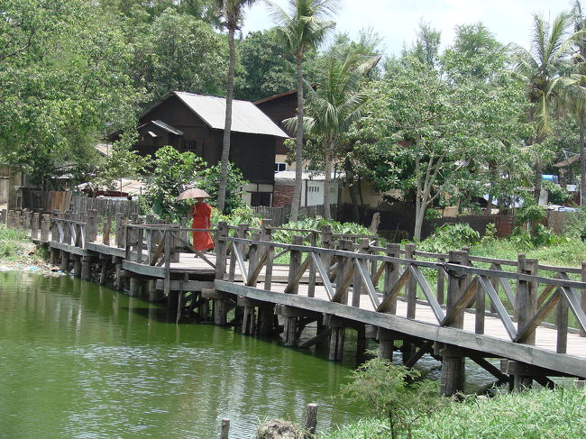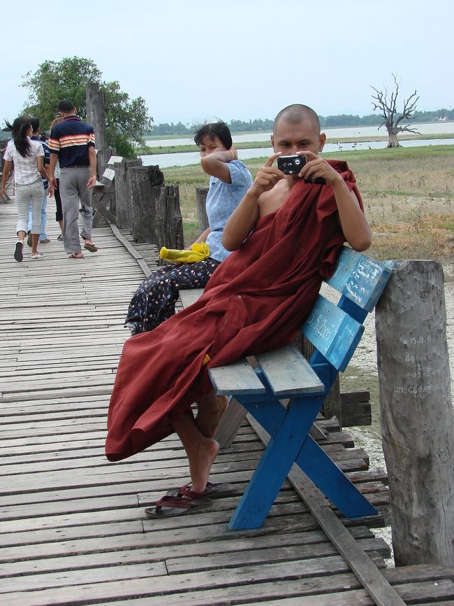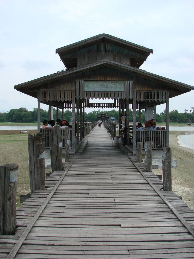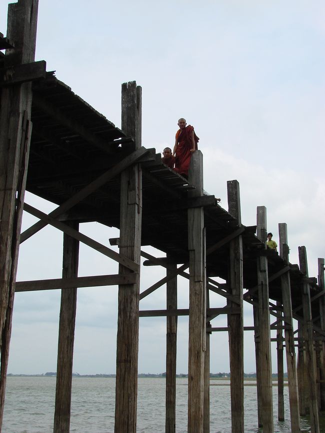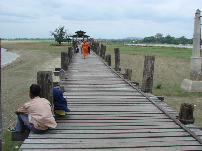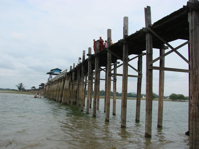 マンダレイへ着き同じ宿へ行き今度は7ドルの大きな部屋にした.エアコン,バス,トイレ,冷蔵庫付,きで大きなダブルベッドだから文句は言いません.日にちがあまったので町をぶらつきマンダレイから南へ7km位いった所に在るアマラプラへ行ってみた此処は大きな池が在りそこにチーク材で造った長い橋が架かっている.今はまだ本格的雨季に入る前なので水位が低く半分ほどは地面に成っていた.