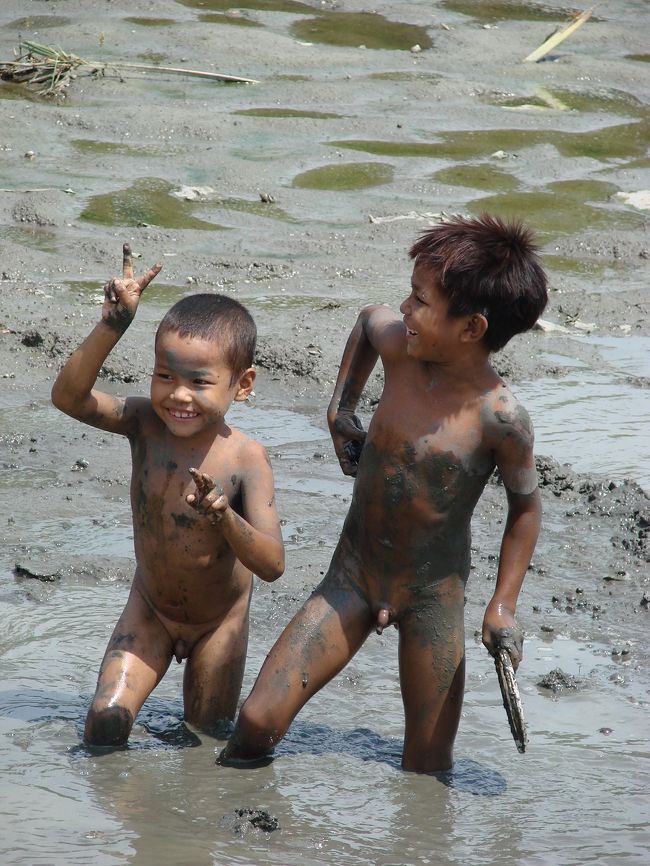 - 池の淵なのか田圃の中なのか ドロンコ遊びの元気な子 自然体の V サインは笑顔が素晴らしい !!