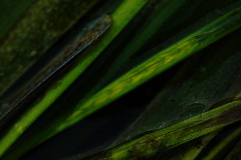アマモの葉の上をメバルの稚魚が逃げていく。