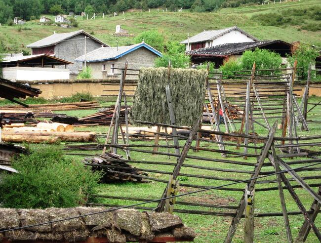 2階の部屋から眺めた村の光景です。干し台に少しばかりの農作物が架けられ、作業のチェーンソーの音が続いていました。