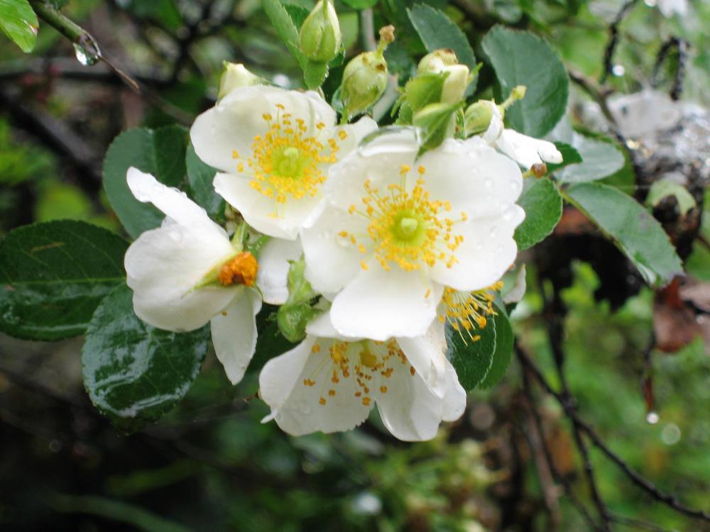 道の脇に咲いていた潅木の白い花です。つる薔薇のようでした。お茶の花にも良く似ています。黄色の金枝梅もあちこちで見かけました。