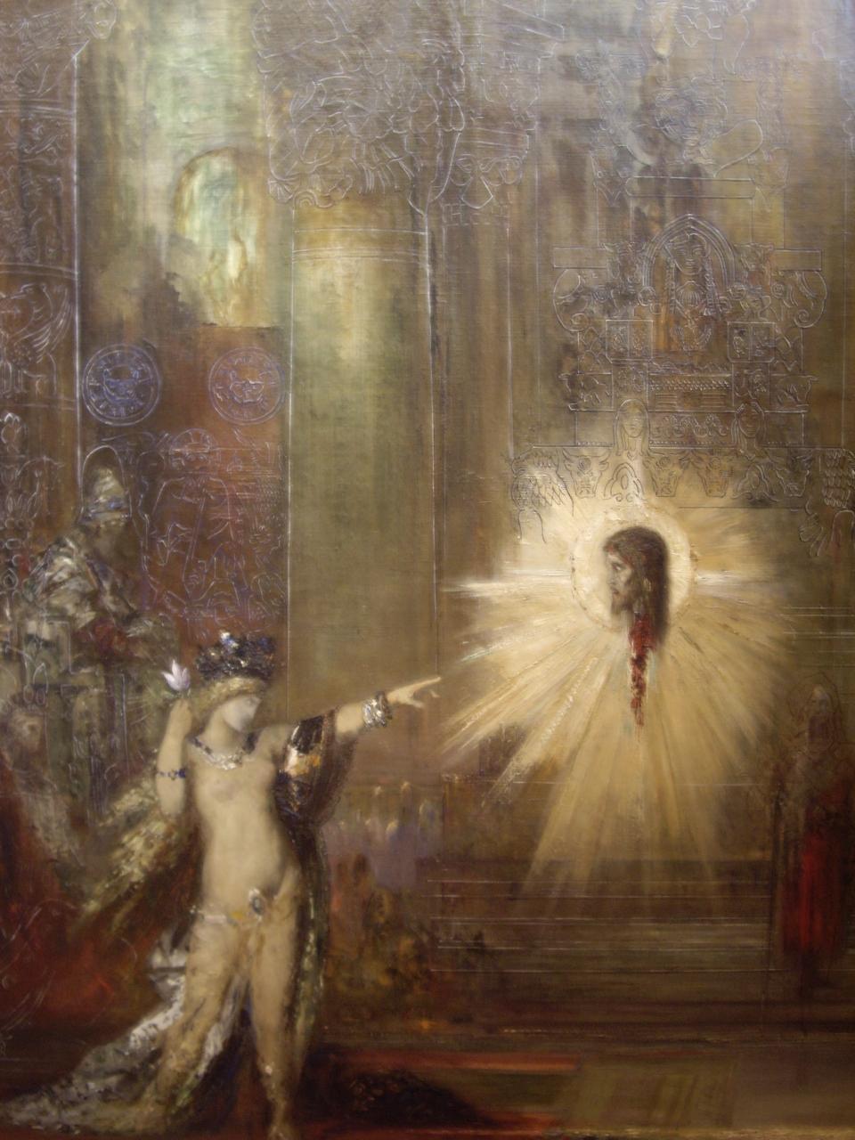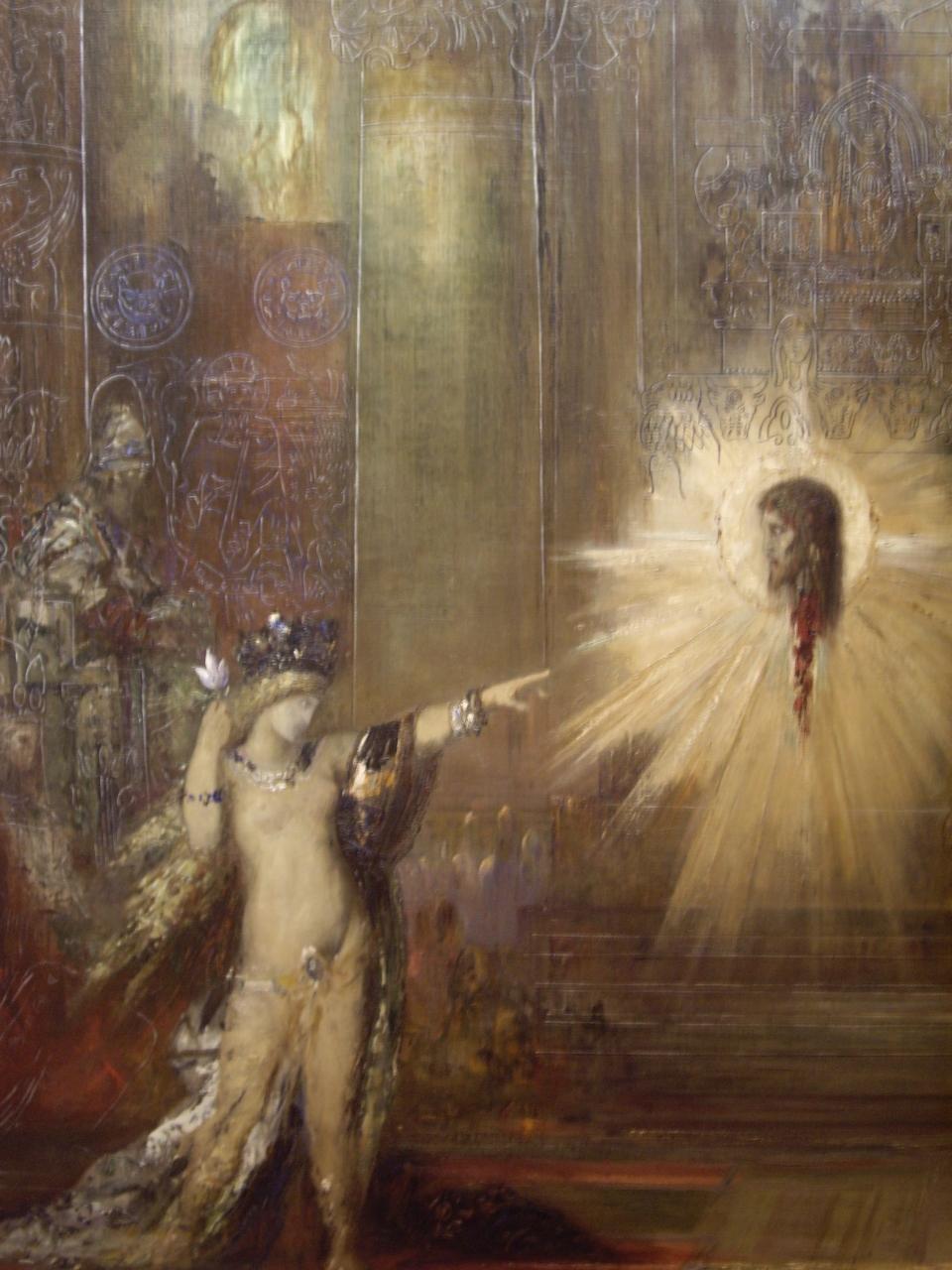 モローのサロメ(『出現』)は、ワイルドの甘美でセクシーな雰囲気はなく、映画のクライマックスのような劇的で緊張感のある描写です。