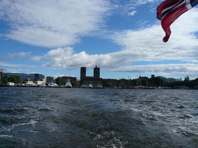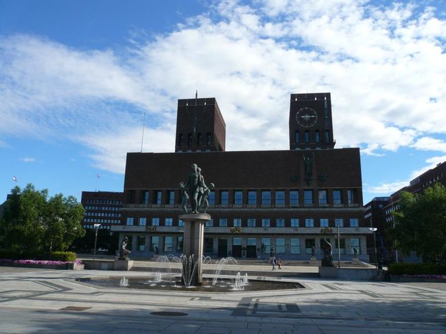 ビィグドイ Bygdøyへフェリーで行くために市庁舎前広場 Rådhusplassenにやってきた。 オスロ市庁舎 Rådhuset i Osloも青空に綺麗に映えていた。