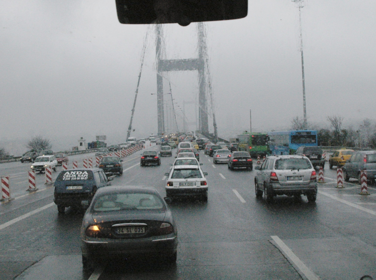 12時に、ボスポラス海峡に、最初にイギリスが架けた橋である第一ボスポラス大橋(中央スパン1074m、1973年完成)を、アジア側からヨーロッパ側に渡る。ラッシュ時には、渋滞がひどいとの事だが、20分位の渋滞で渡る事が出来た。