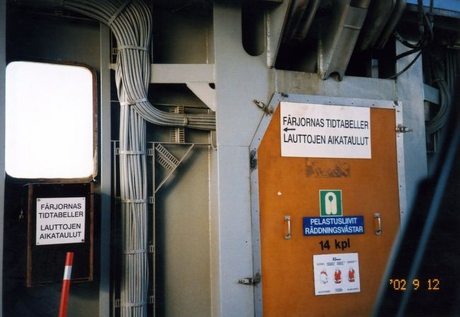 Saaristoのフェリーの時刻表。このフェリーは日中15-30分ごと、24時間営業で深夜も015,045,145,315,415,515,545とある。とても便利だ。ただ甲板に車を載せるだけの簡単なもの