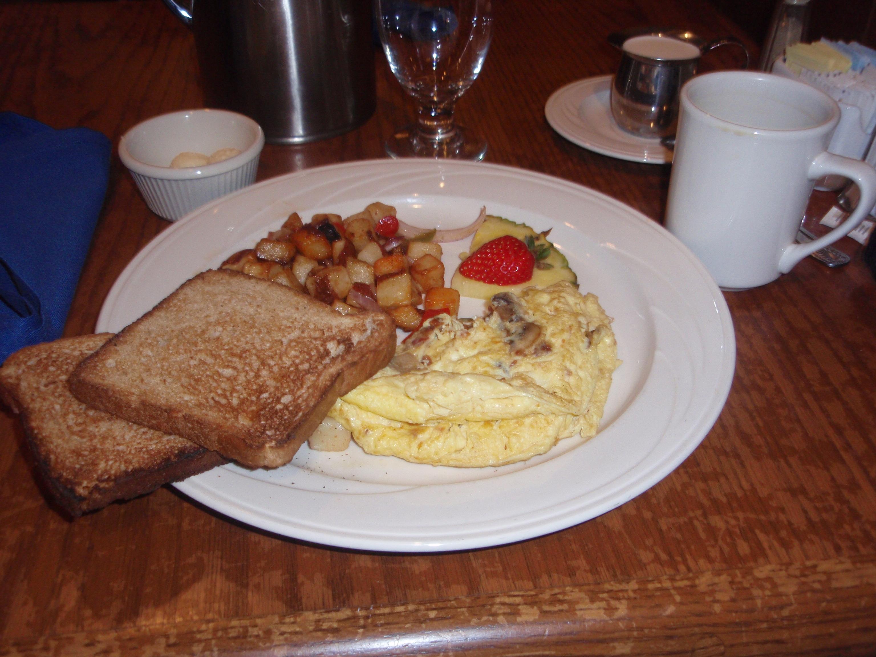 この日の朝食。オムレツのトッピングにはベーコンとマッシュルームを。
