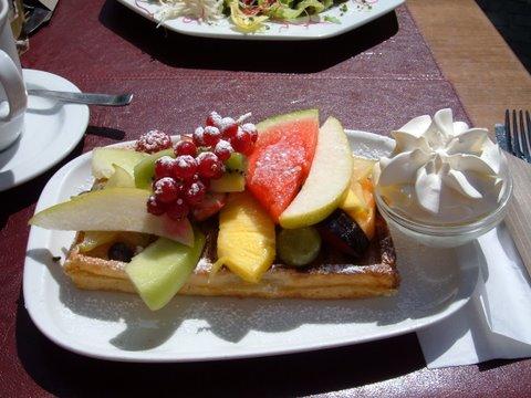 ベルギーの名物のワッフル。 ブルージュのカフェAquarelでいただきました。 Thee Melk(ミルクティー)と一緒に。 美味しい。