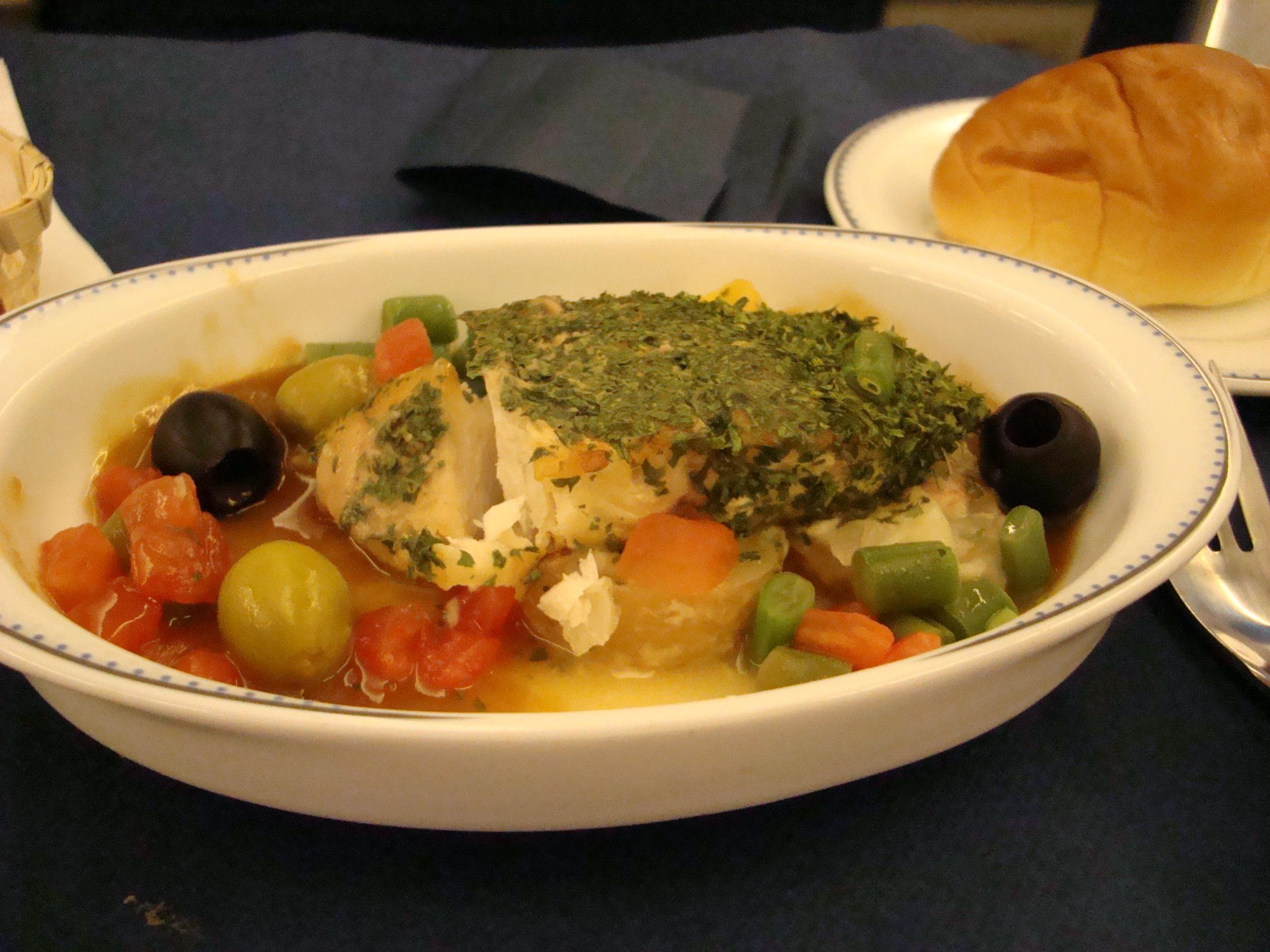 行きの便でのメイン料理。お魚です