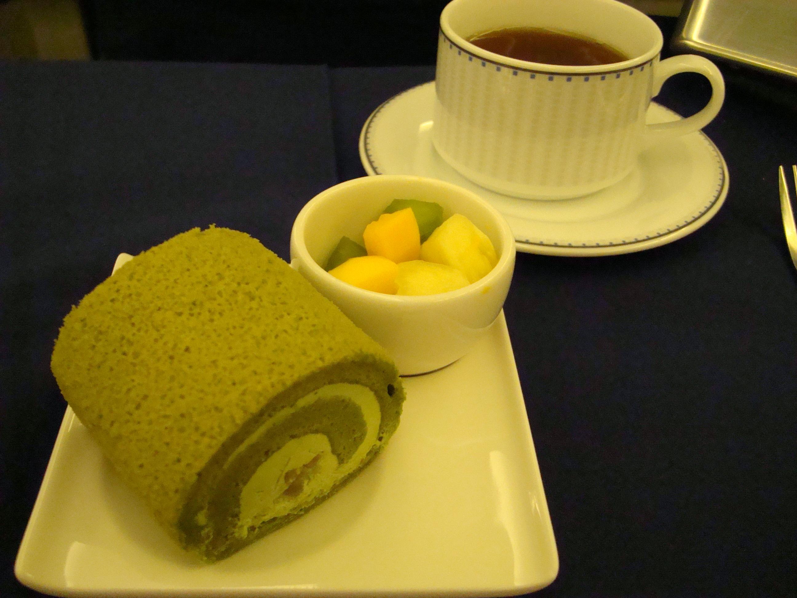 行きの便のデザートです。抹茶ロールの色がきれいに写真に写ってないのが残念