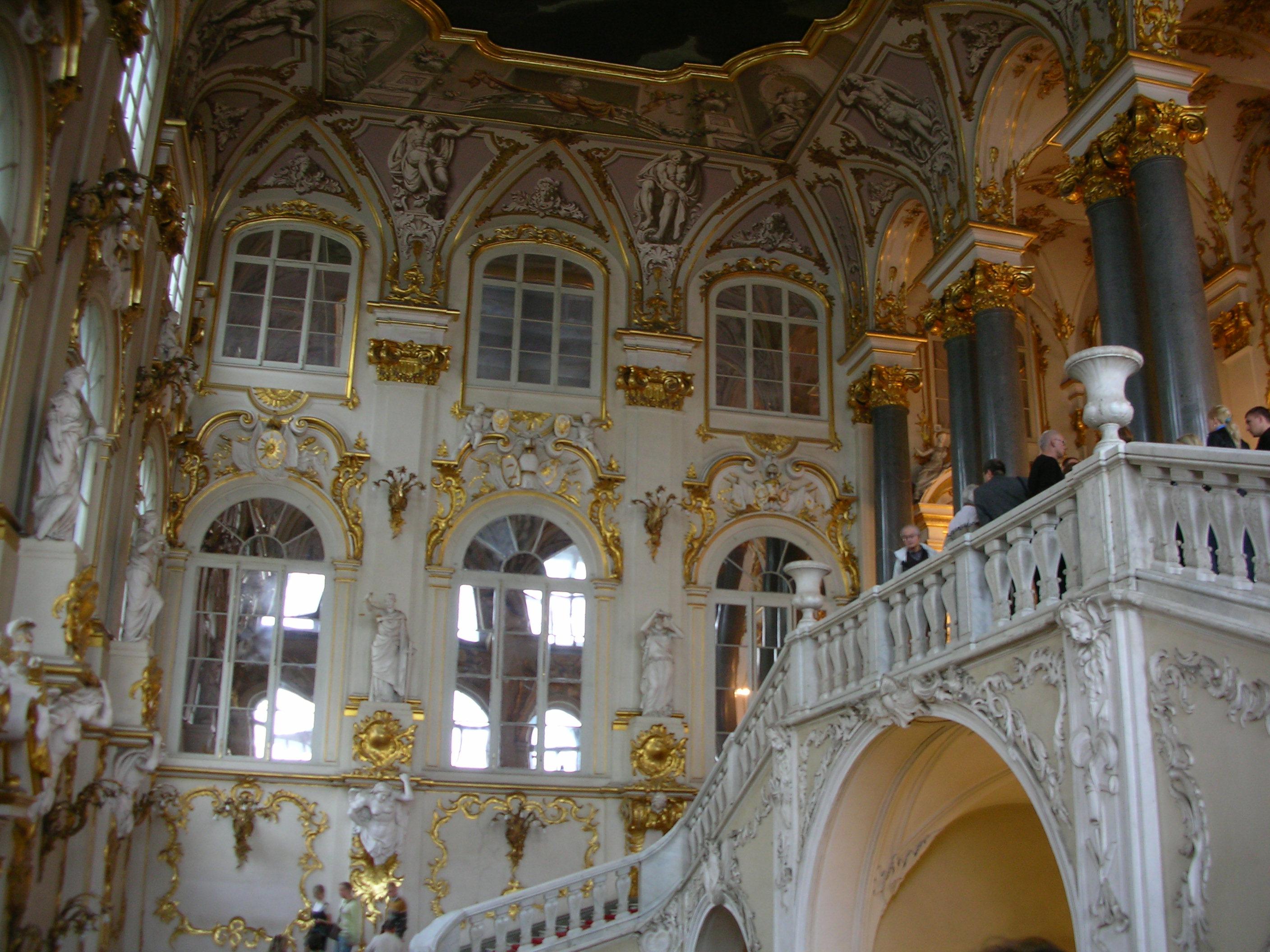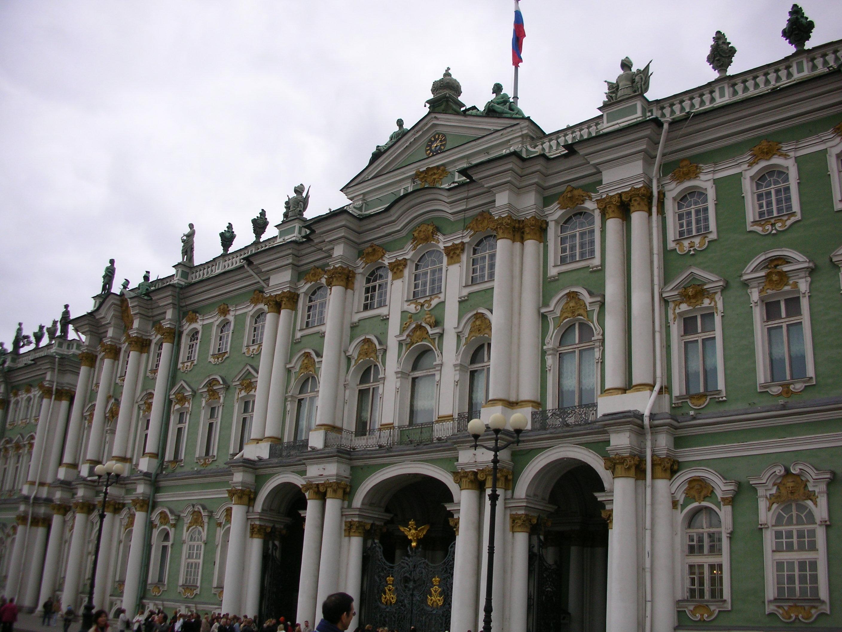 エルミタージュ美術館外観。元々宮殿だった建物なので、美術館といえど、豪華です。これですでに3つの宮殿を見ました。エカテリーナ宮殿は水色、ピョートル大帝夏の宮殿は黄色、そしてここは緑色。
