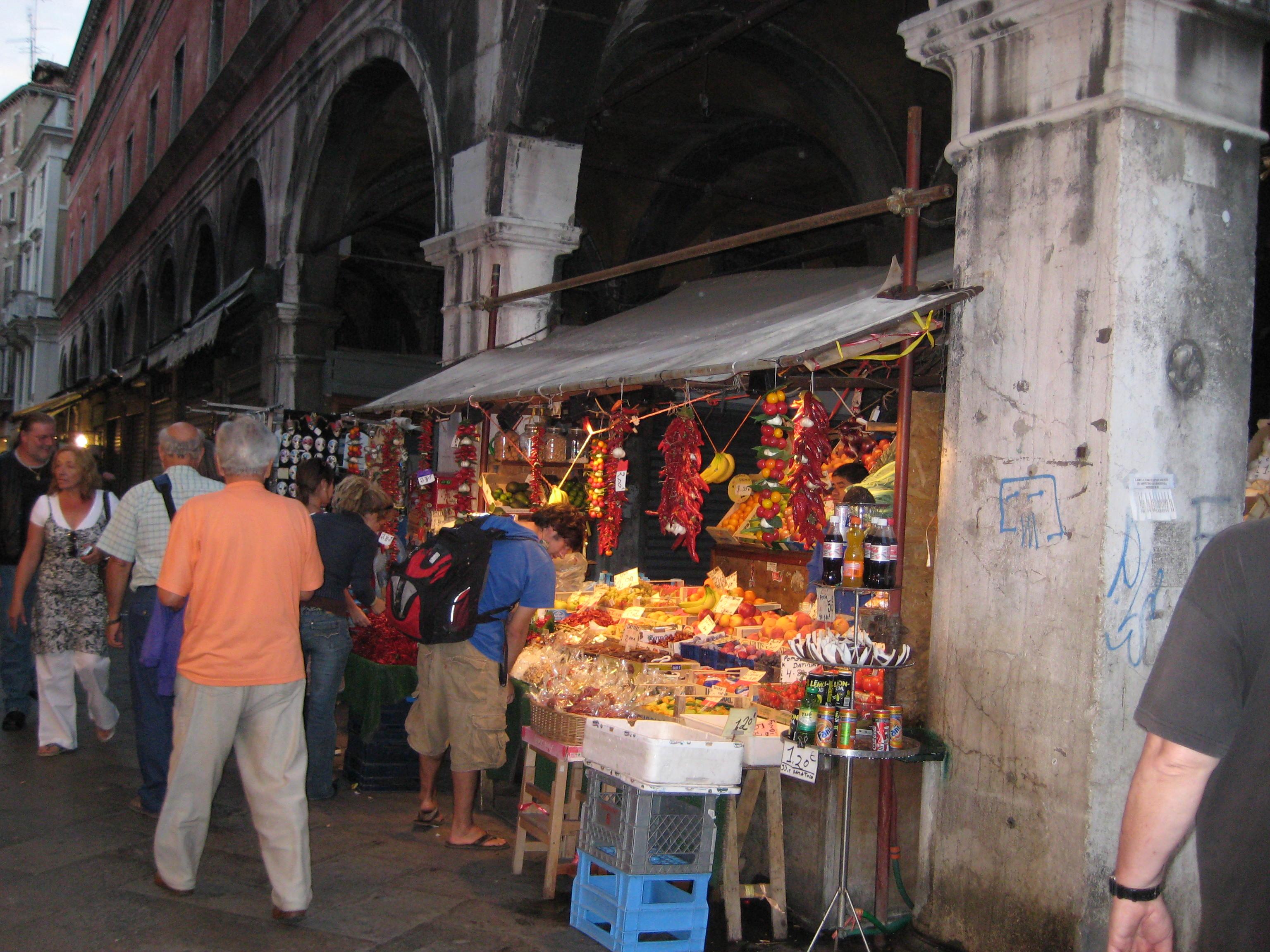 この写真はリアルト橋付近。屋台で果物、野菜などを売っていた。