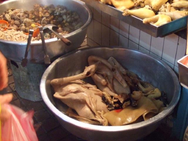 鶏肉屋さん…後ろのケージに生きた鶏がいます。その場でさばいているんですね〜。