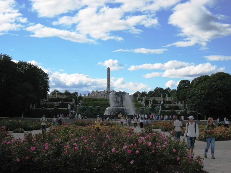 ムンクを堪能後、ヴィーゲラン公園へ向かった。ここも地下鉄利用だ。ノルウェーの彫刻家、ヴィラーゲンが彫った彫刻が多数ある公園で、人間の数は、650体以上あるという。地下鉄を降りてから道に迷ったものの、無事、公園に到着。緑の多い公園だ。