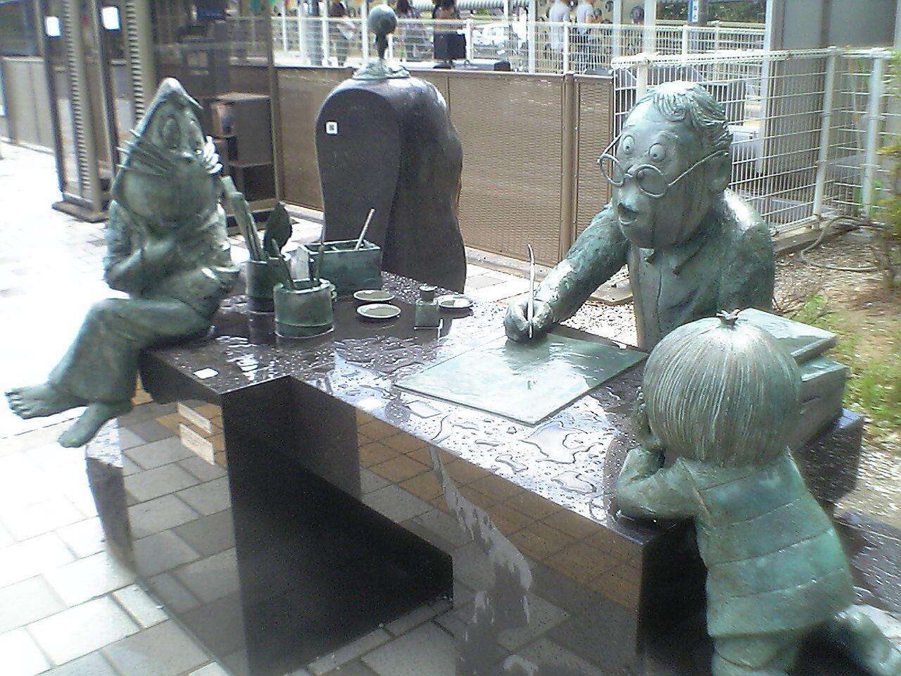 境港駅、別名鬼太郎駅を降りると、まず出迎えてくれたのが水木しげる先生執筆中のブロンズ像。