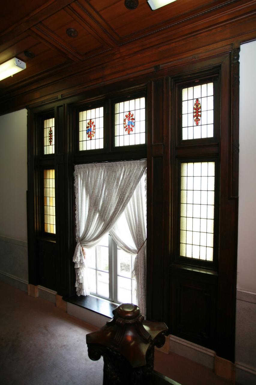 皇居を臨む赤レンガの外壁、大理石の門をくぐると現れる彫刻の施された木階段、皇居サイドのお濠に向かって開く踊り場の大窓上部にはアールヌーボーの光彩を放つステンドグラスなど、旧建物が建てられて大正時代の面影を残しています。