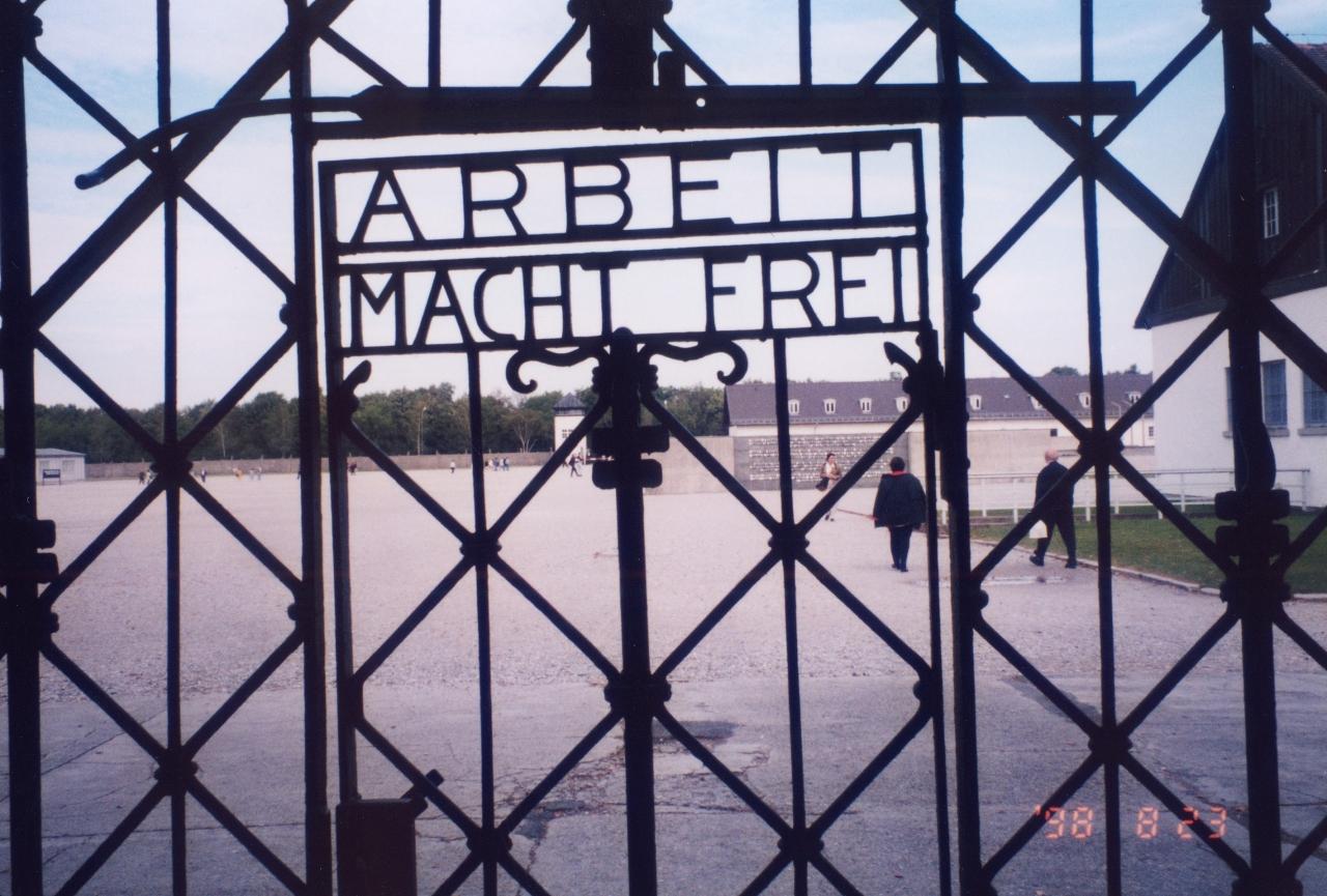 (入り口の Arbeit macht frei.=「働けば自由になれる」の文字)