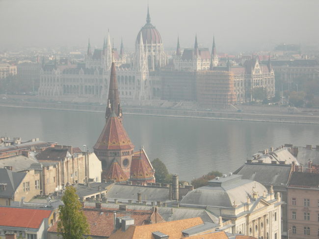 砦からの眺め。かなり霞んでますが、手前にブダの街並みとドナウ川を挟んで国会議事堂が見えます。