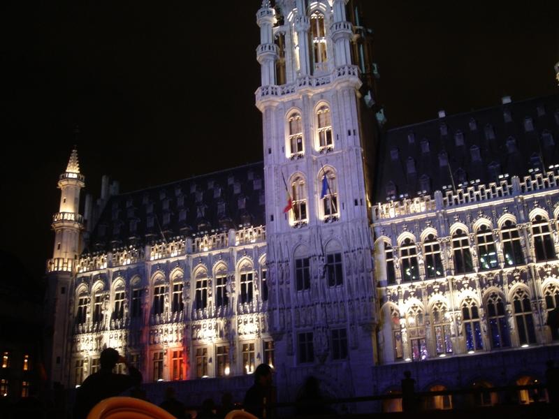 さてさて、気分も落ち込み気味ですが、グランプラスに戻ってきました。ショーがあると聞いて、人もいっぱい集まってきました。いきなり真っ暗になって音楽がなり出しました。