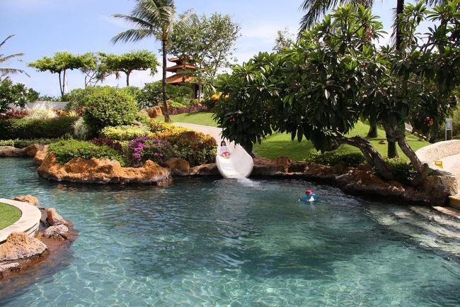 ひとしきり寝た後、昼ごはんを食べてまたプールに。今度は広いほうのプールでのウォータースライダー。