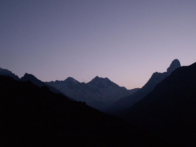 4時59分、日の出まではまだまだですが、ほんのりと明るくなっています。太陽はこの方向から昇るので完璧な逆光です。エヴェレスト、ローツェ、アマダブラムはシルエットのようです。夕方なら夕日が山を照らしてオレンジ色に染まることでしょう(晴れればの話)。