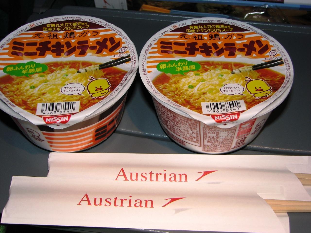 おにぎりも食べたかったが、チキンラーメンにしました。飛行機に乗ったらカップラーメンを食べなきゃ、と・・・。 -