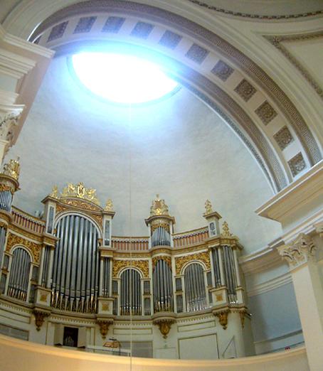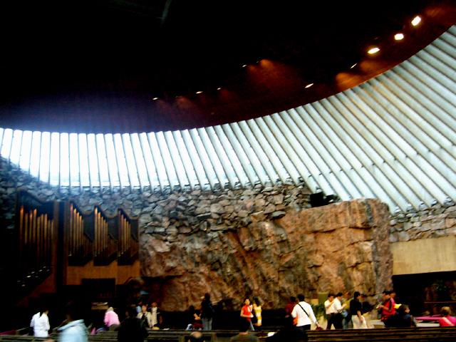 内部も自然の岩肌そのまま。立派なパイプオルガンもあり音響効果はとても良さそう。