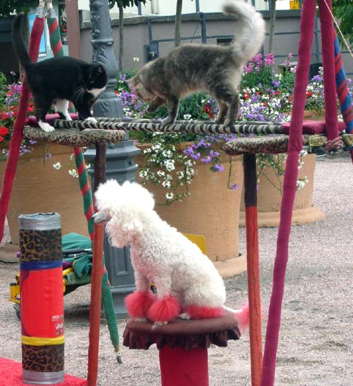 ワンちゃんと猫ちゃんに色々芸をさせているオバチャン大道芸人発見。ワンちゃんも猫ちゃんもとってもお利口で皆、拍手喝采!