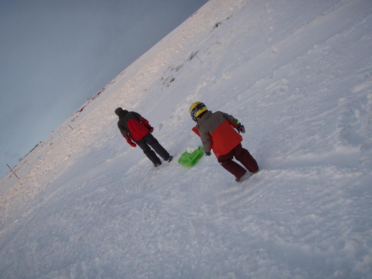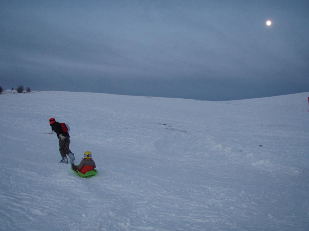 さて、初日は暗くなり始めた夕方から、ヘッドランプ着用で子供とそり遊び。月の光が明るく、パラグライダーなどもまだ飛行していた。