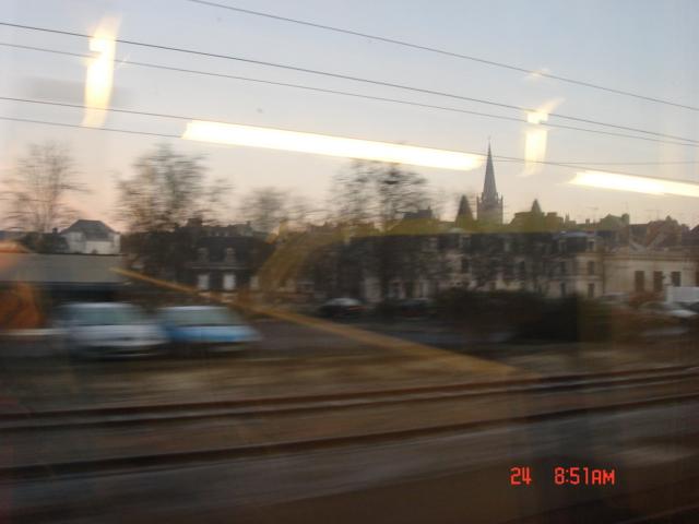 TGV 8603にてMonparnasse駅を07:05出発、途中で夜が明けてきた。古い街並みが時々窓から見える。 -