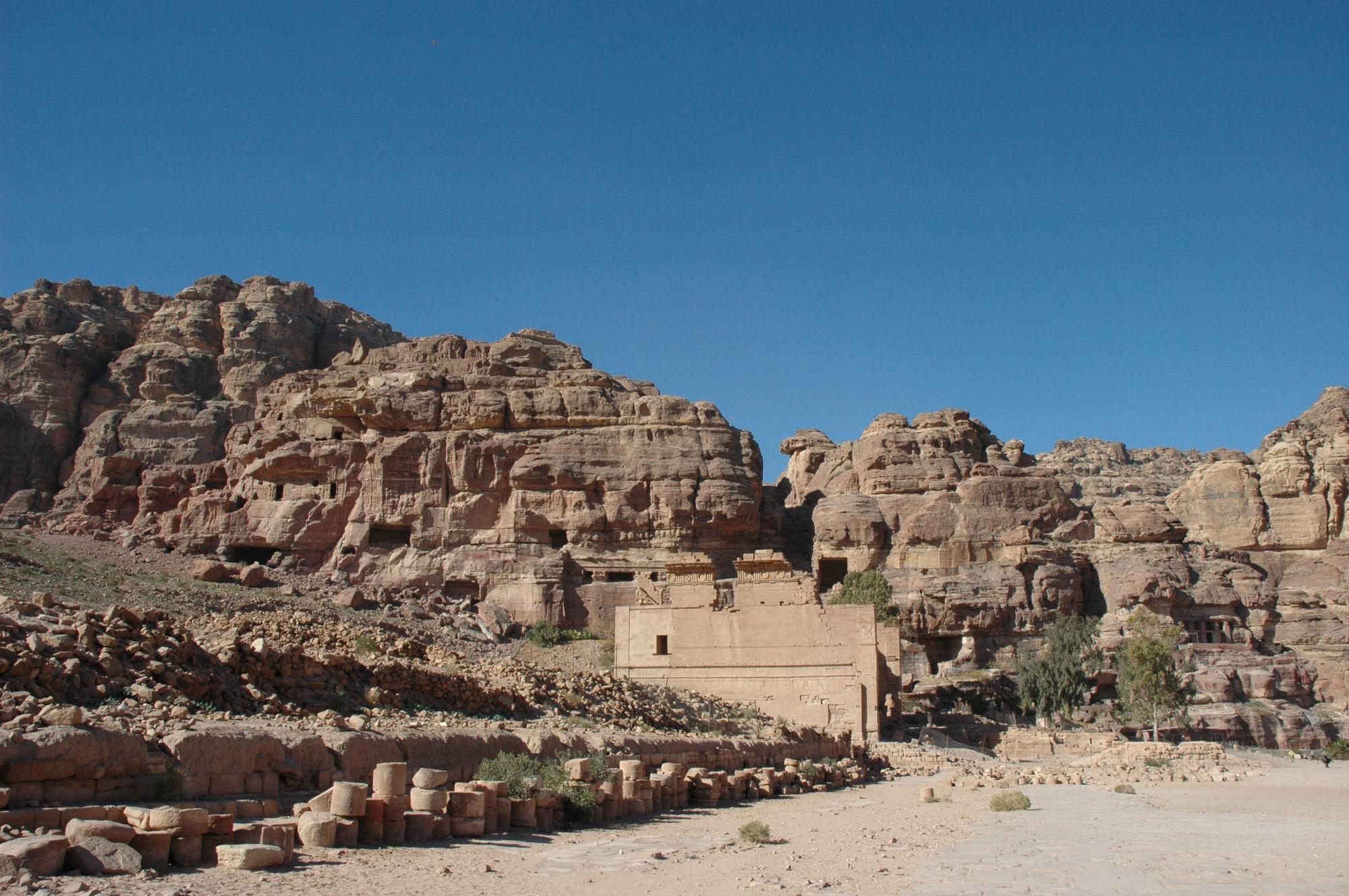 大寺院の柱の向こうに王家の墓、クブサ山。このあたりは神殿、宮殿、官庁、公共浴場が集中し、ペトラの中心地のはずなのに、殆ど地震により崩壊してしまっている。