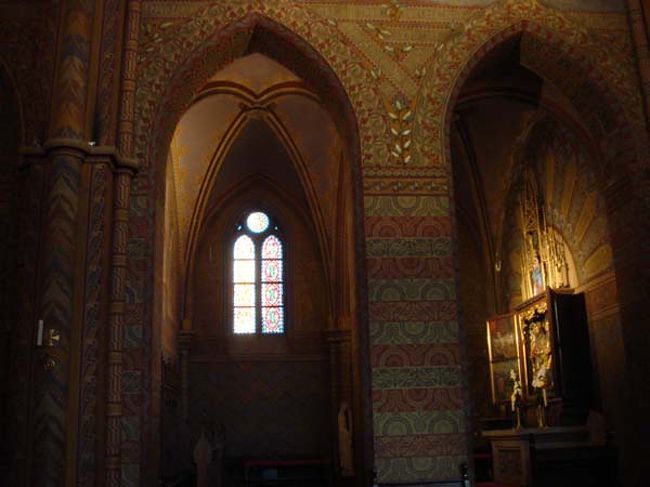 この教会は、ロマネスク様式で建てられたものが14世紀にゴシック様式に改築、16世紀にはトルコ軍襲来によって教会はイスラム寺院となってしまいました。その後、18世紀にバロック様式のキリスト教会に修復されました。1867年には、オーストリア=ハンガリー二重帝国の王に就いたフランツ・ヨゼフ一世とエリザベート皇妃の戴冠式が行われた教会でもあります。フランツ・ヨーゼフがゴシック様式に戻すように命じたときに取り入れられたハンガリー風装飾芸術装飾などが独特の雰囲気を醸し出しています。 -