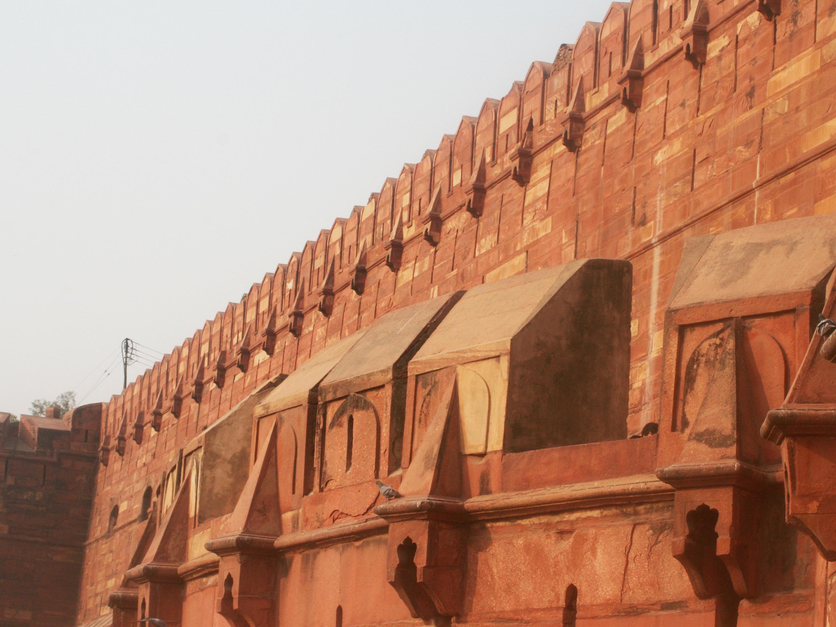 城壁の上部の光景です。少しひび割れした石材も見えました。アグラ城は創建以来、度々の増改築が行われたようです。
