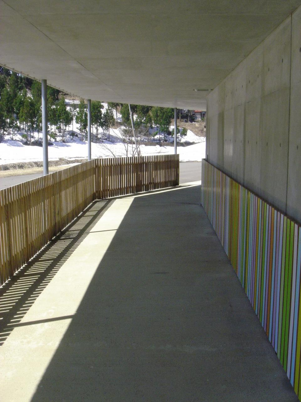 松代駅から農舞台へのアプローチに設置されているカラフルなカラーバーには松代の人々の屋号が書かれており、さらに歩く人に反応し地元の人々の呼びかける声がスピーカーから流れる。