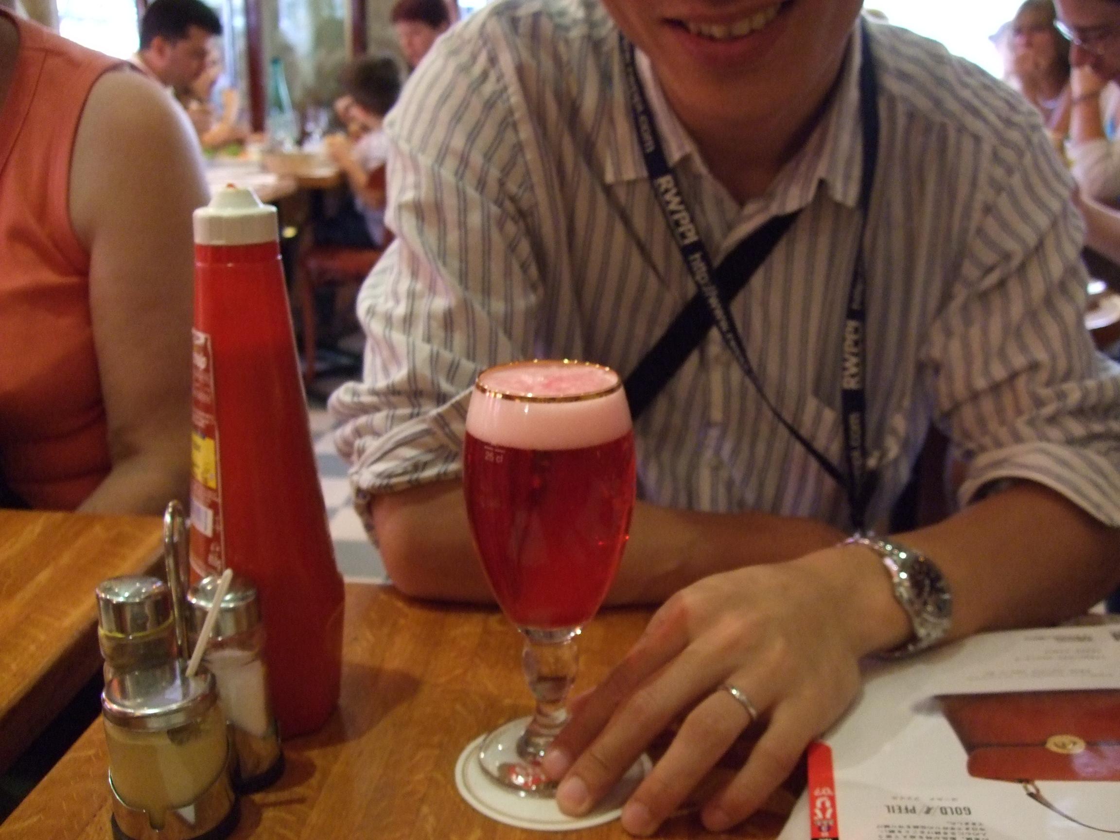 ビールを頼んだつもりだったのにでてきたら真っ赤なアルコール飲料がでてきました。