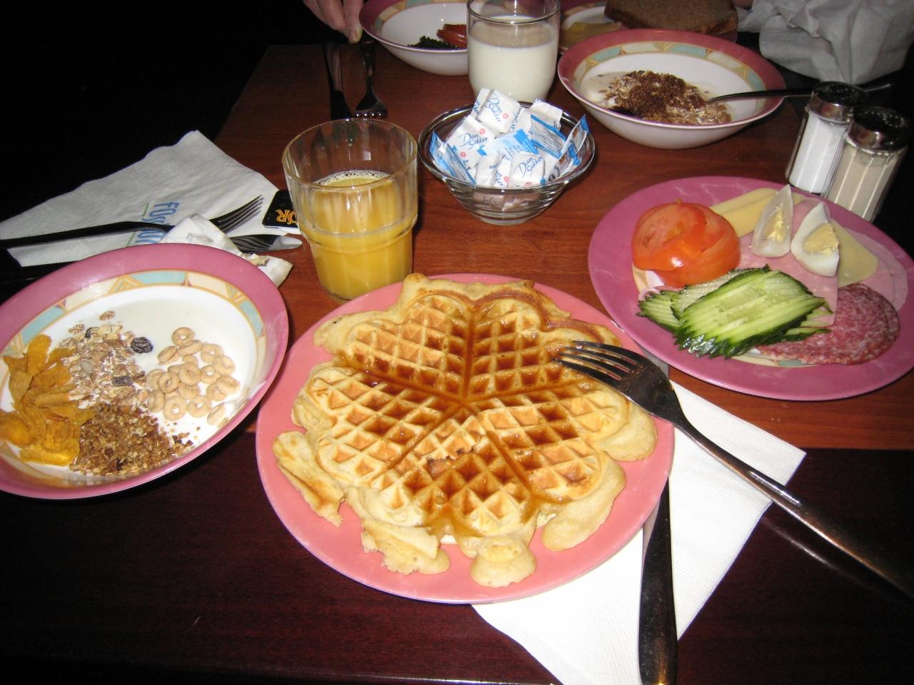 フォスホテルバロンの朝食です。メニューは、ハム、チーズ、野菜、ヨーグルト、シリアル、パン等、ほとんどが冷たいもので、寒い朝にはちょっと寂しい感じでしたが、ワッフルメーカーがあったのは良かったです。