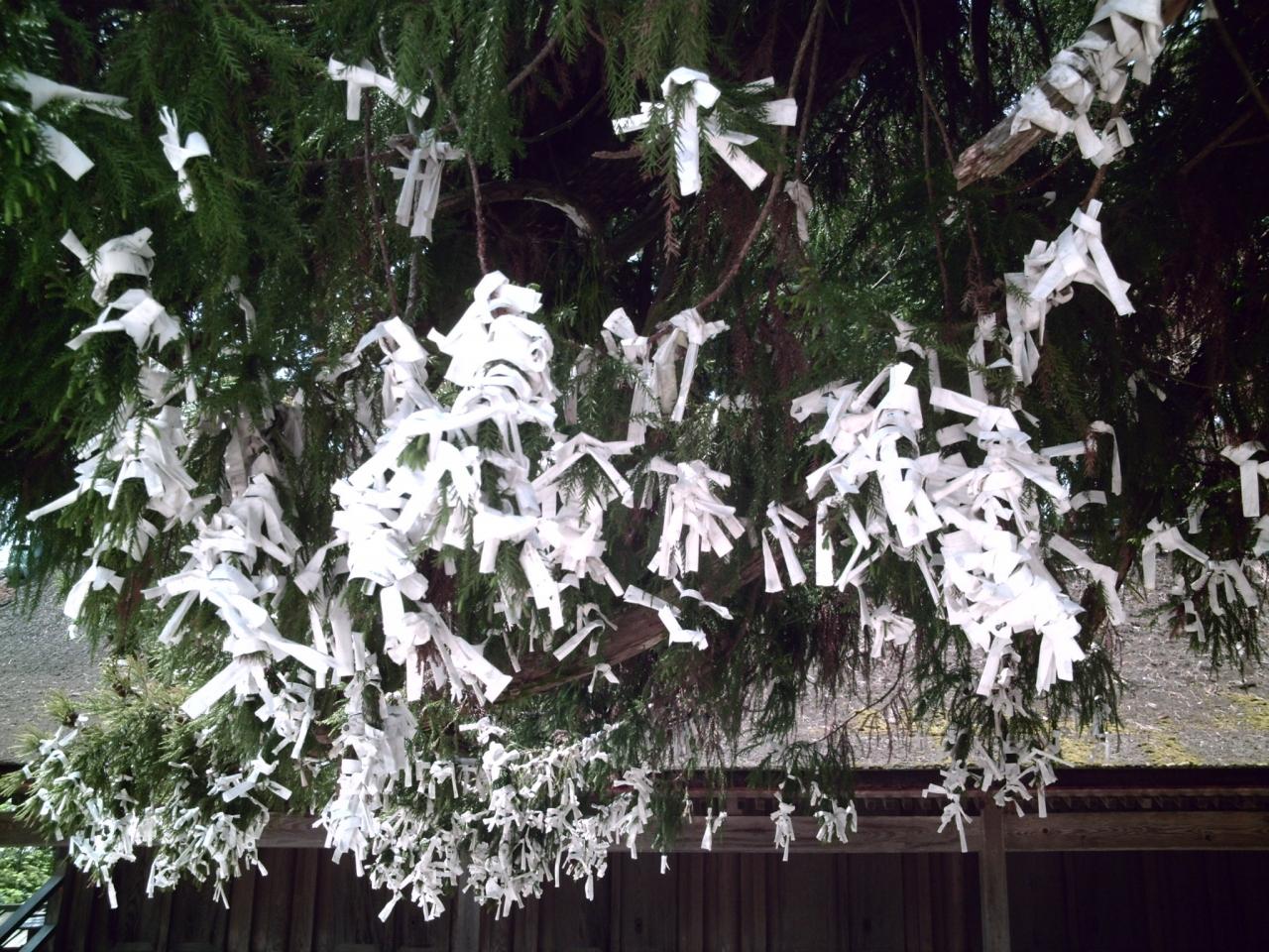 木の枝がおみくじで真っ白に埋まっていました。 -