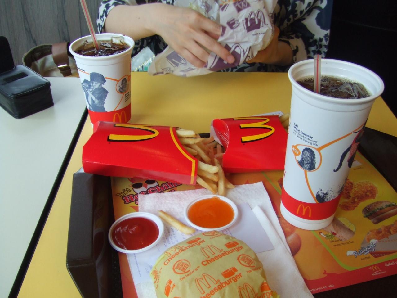 チーズバーガーセットMとホットチキンセットLを頼む。2つで220B。どっちも小さいサイズを頼んだつもりだったけど・・・。相当でかい。