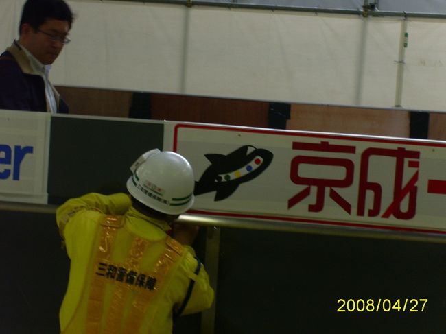 写真は日暮里駅で工事用テープを使って臨時案内板を作る名物警備員さん。