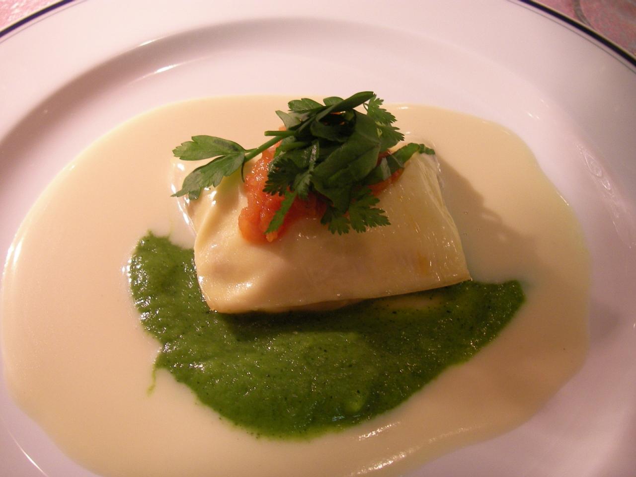 平目の湯葉包み蒸し バジルのムスリーヌ添え